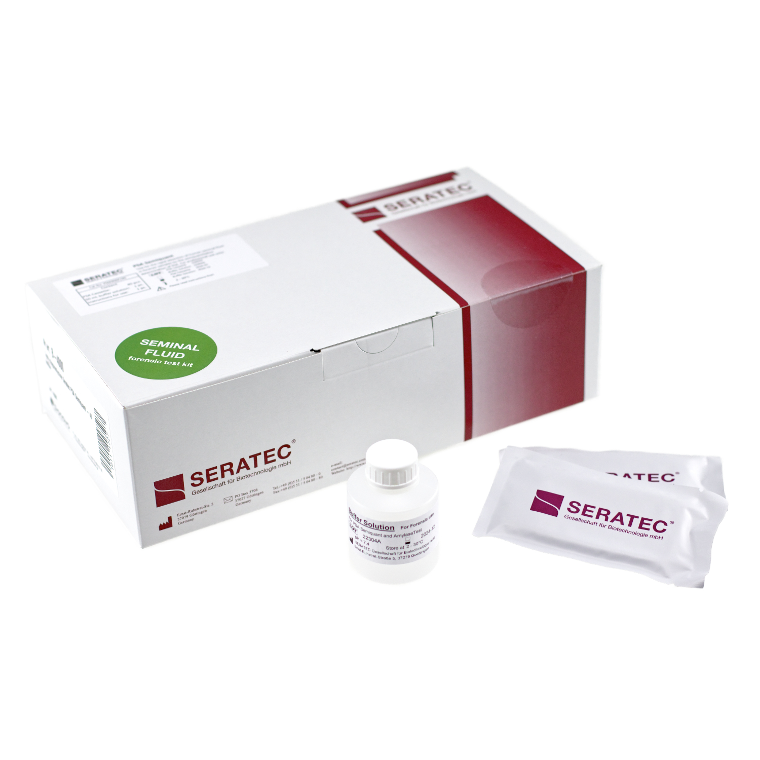 Seratec® PSA Semiquant chromatograficzny test immunologiczny do szybkiego półilościowego wykrywania swoistego antygenu sterczowego (PSA). Wykorzystywany w kryminalistyce do identyfikacji nasienia. Test wykrywa PSA w stężeniach od 1 ng/ml. Idealny zarówno do badań terenowych, jak i laboratoryjnych. Opakowanie zawiera 40 kaset testowych, 50 ml buforu ekstrakcyjnego oraz instrukcję obsługi.
