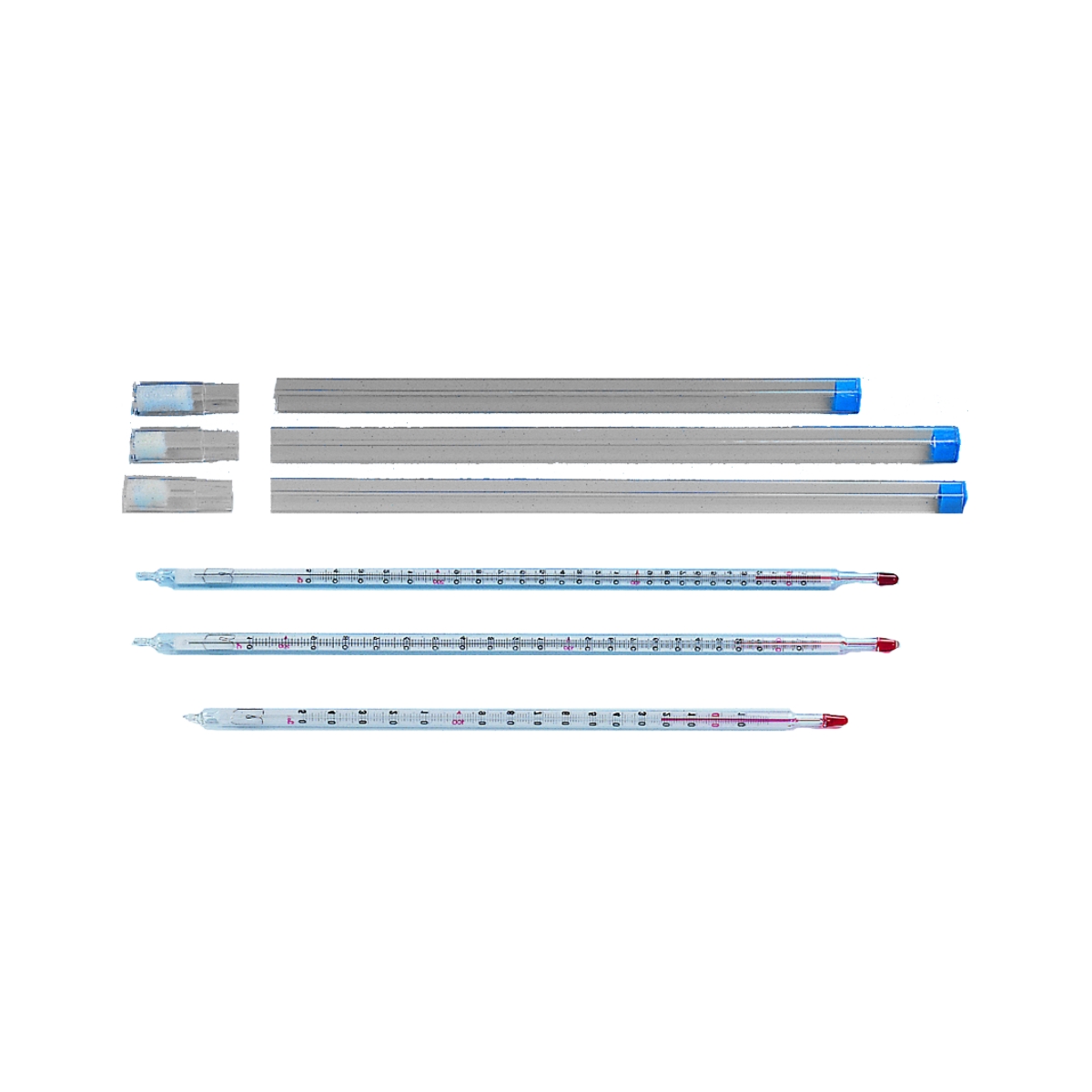 Termometry cieczowe, bez rtęci. Wypełnione specjalną czerwoną cieczą. Średnica 7-8 mm. Podziałka 1/1°C. Dostarczane w korpusie ochronnym z tworzywa sztucznego.