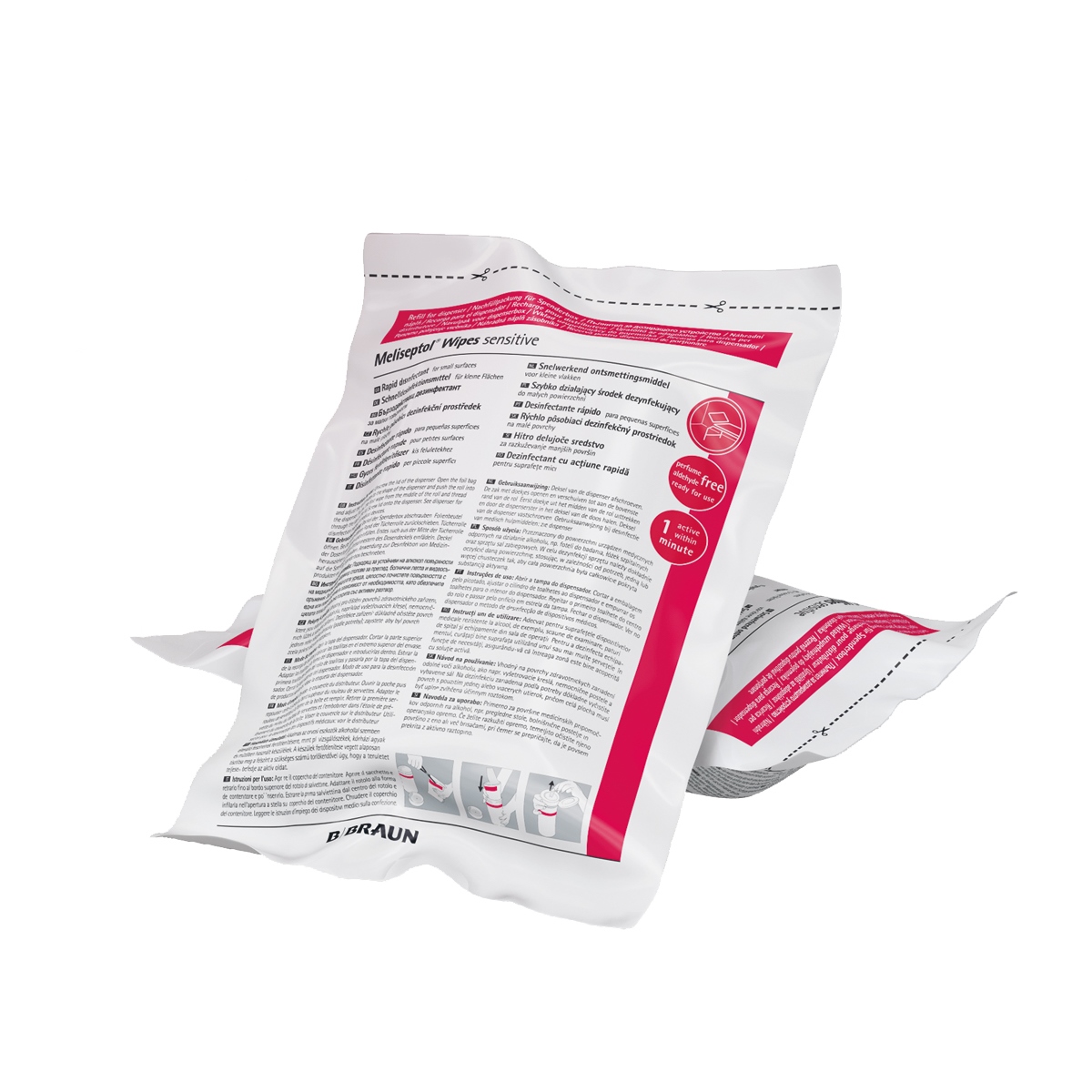 Chusteczki Meliseptol® Wipes sensitive nasączane płynem na bazie 1-propanolu i chlorku didecylodimetyloamoniowego. Wykonane z flizeliny, dzięki czemu nie rysują powierzchni. Nadają się do większości materiałów, m.in. szkła akrylowego, makrolonu, silikonu, lateksu i gumy.