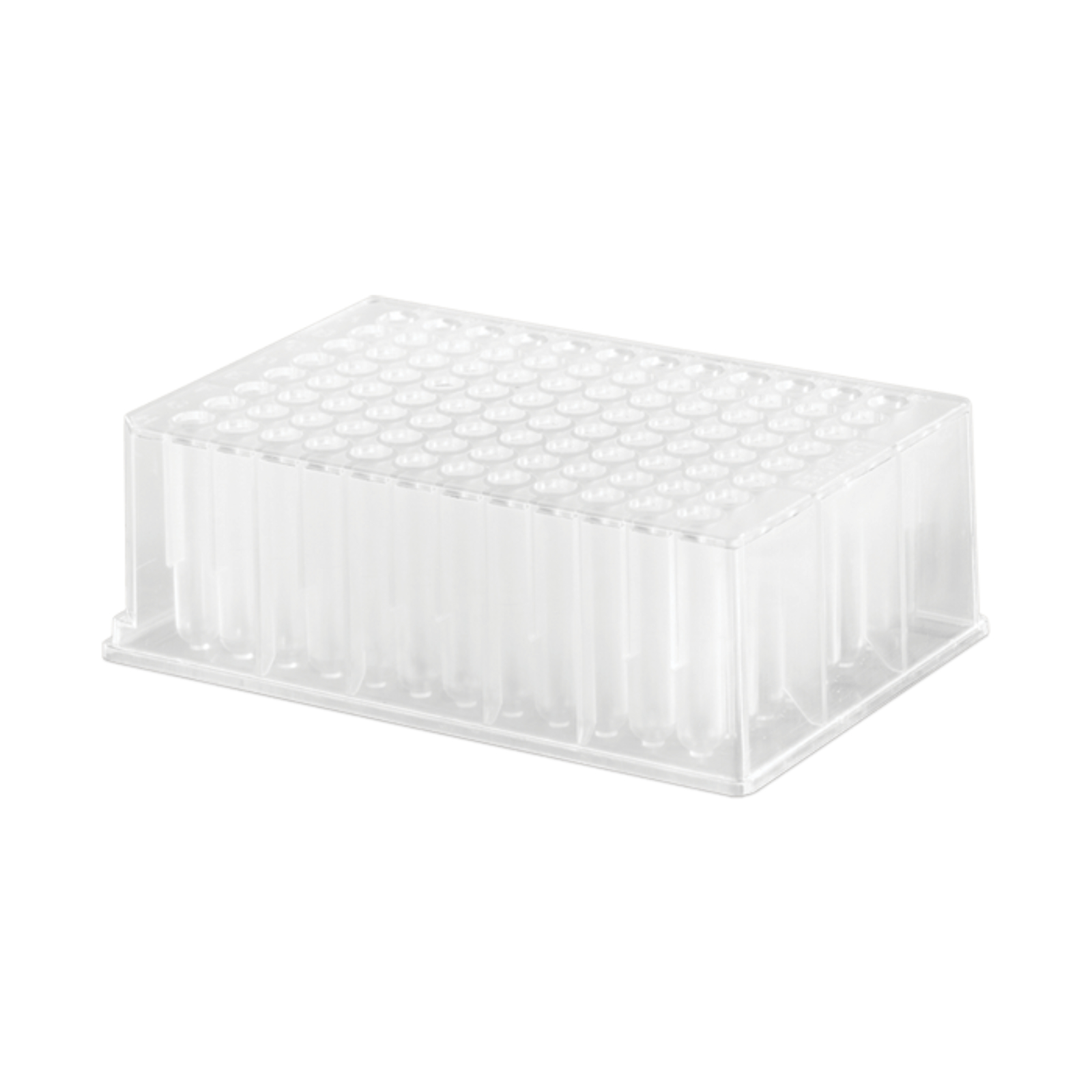 Płytki titracyjne z 96 stanowiskami o pojemności 1,0 do 1,2 ml. Wykonane z polipropylenu. Mogą być ustawiane piętrowo. Nadają się do wirowania. Opakowanie zawiera 24 sztuki.