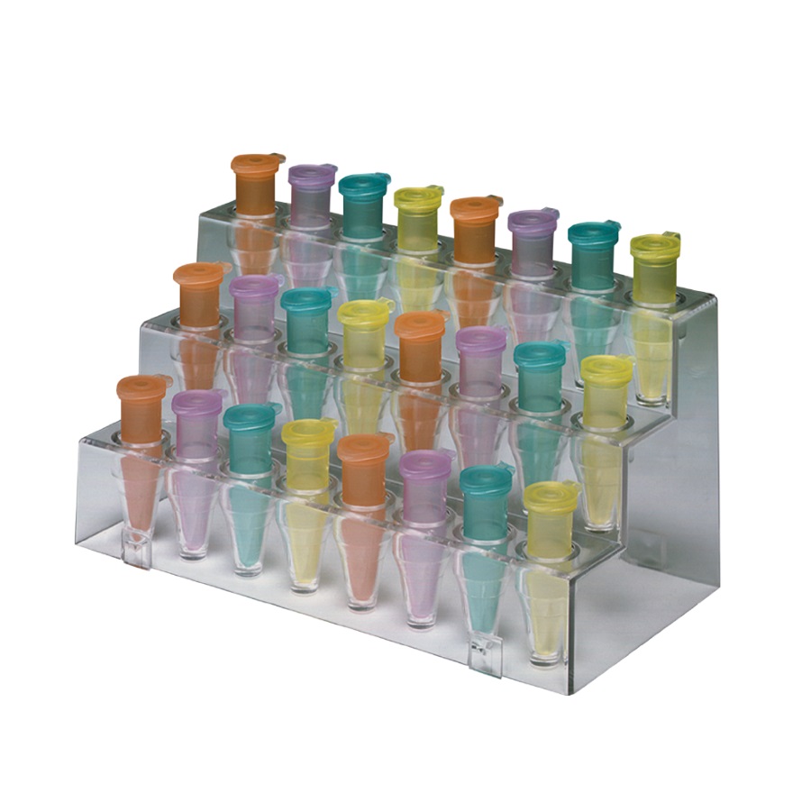Wykonany z przeźroczystego polistyrenu. Doskonale nadaje się do prac związanych z pipetowaniem niewielkich objętości i rozcieńczaniem. Przeznaczony na 96 (8 x 12) stożkowych probówek 1,5 i 2,0 ml. Składa się z czterech złączonych pojedynczych statywów, z których każdy zawiera 24 otwory.