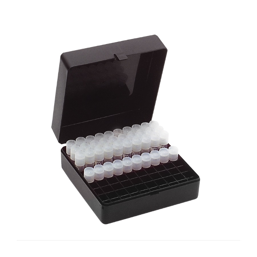 Pudełko wykonane z czarnego polipropylenu. Autoklawowalne. Nadaje się do przechowywania próbek wrażliwych na światło. Posiada 100 stanowisk o wym. 12,5 x 12,5 mm. Przeznaczone na probówki reakcyjne i krioprobówki o poj. 0,5, 1,5, 2,0 ml i maks. wys. 53 mm. Z możliwością układania w stosy. Alfanumeryczny indeks na pokrywce ułatwia identyfikację próbek.