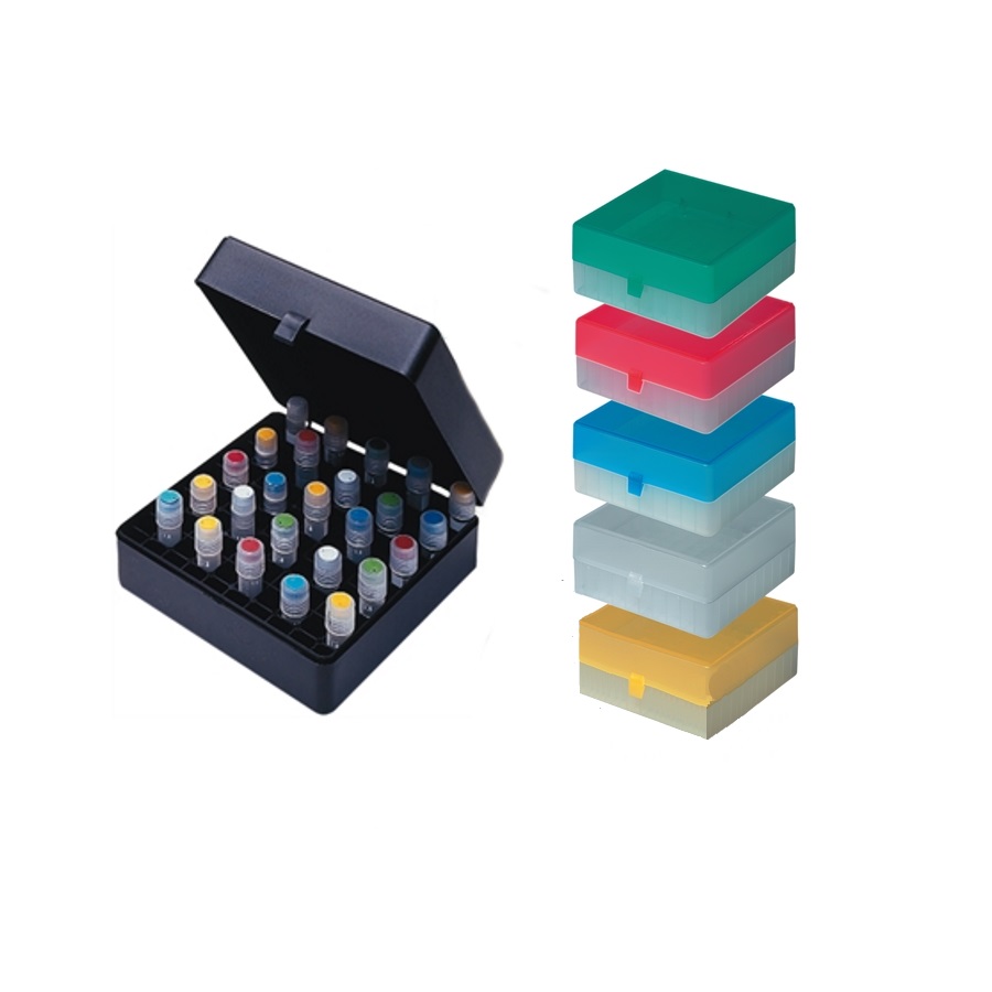 Przeźroczyste pudełko wykonane z PP. 100-miejscowe (wym. otworu: 12,4 x 12,4 mm). Przeznaczone do przechowywania probówek wirówkowych o poj. 0,5 i 1,5/2 ml oraz kriofiolek. Z pokrywką i oznaczeniami alfanumerycznymi do łatwej identyfikacji próbek.