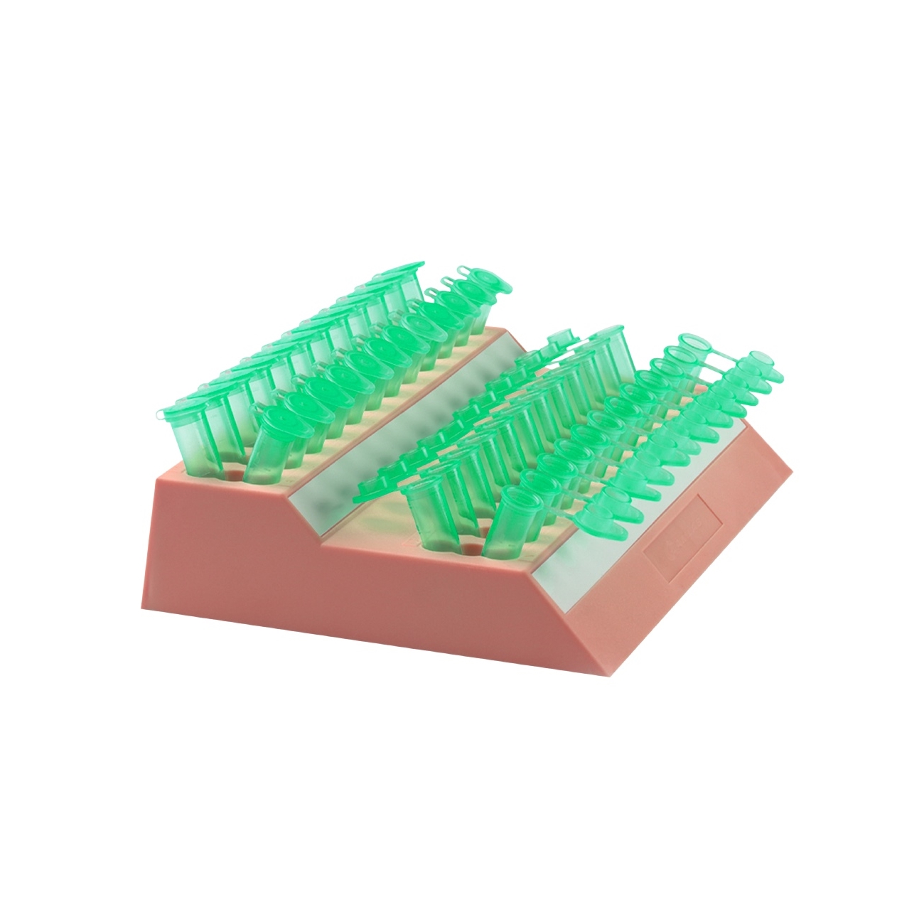 Przeznaczony na maks. 48 probówek (rzędy 2 x 12). Do stosowania z mikroprobówkami o pojemności 1,5 ml. Alfanumeryczne oznakowanie rzędów. Probówki mogą być ustawiane w pozycji pionowej lub lekko pochylonej pod kątem do przodu lub do tyłu. Posiada zmywalne pole do opisu. Dostarczany z dwoma markerami (czerwony i czarny).