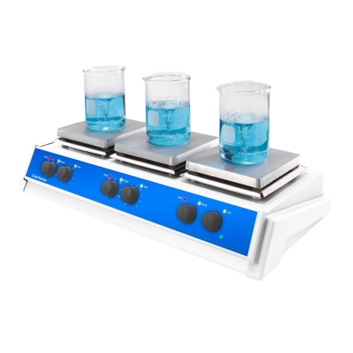 Urządzenie o wysokiej stabilności i równomiernym rozprowadzaniu temperatury. Glinowo-krzemowa, chemicznie odporna płyta grzejna z trzema niezależnymi stanowiskami do grzania i mieszania. Gdy temperatura płyty przekracza 50°C, zapala się lampka ostrzegawcza. Powierzchnia trzech płyt pozwala na ogrzewanie większej ilości próbek w tym samym czasie, w rożnych temperaturach i przy różnej prędkości obrotów.