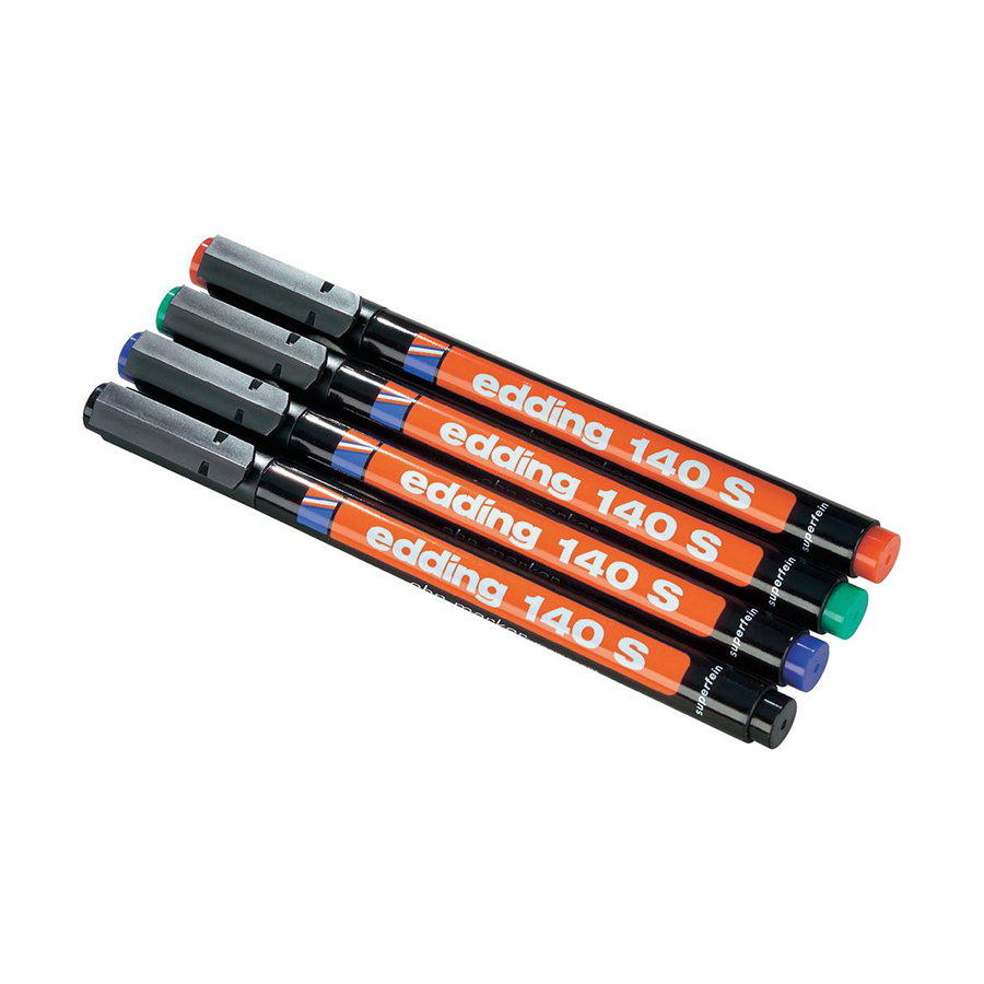 Zestawy markerów permanentnych Edding 140S o grubości linii 0,3 mm. Pisaki są wodoodporne, prawie bezwonne, szybkoschnące. Charakteryzują się intensywnymi barwami i wyrazistą linią. Nadają się do pisania po wielu tworzywach, takich jak folia, szkło, plastik itp.