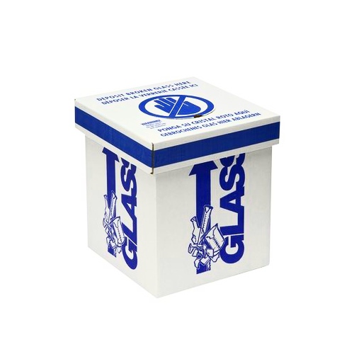 Pudełka do przechowywania odpadów szklanych wykonane z wytrzymałej, grubej tektury, wyposażone w worek z polietylenu i szczelnie przylegającą przykrywkę.