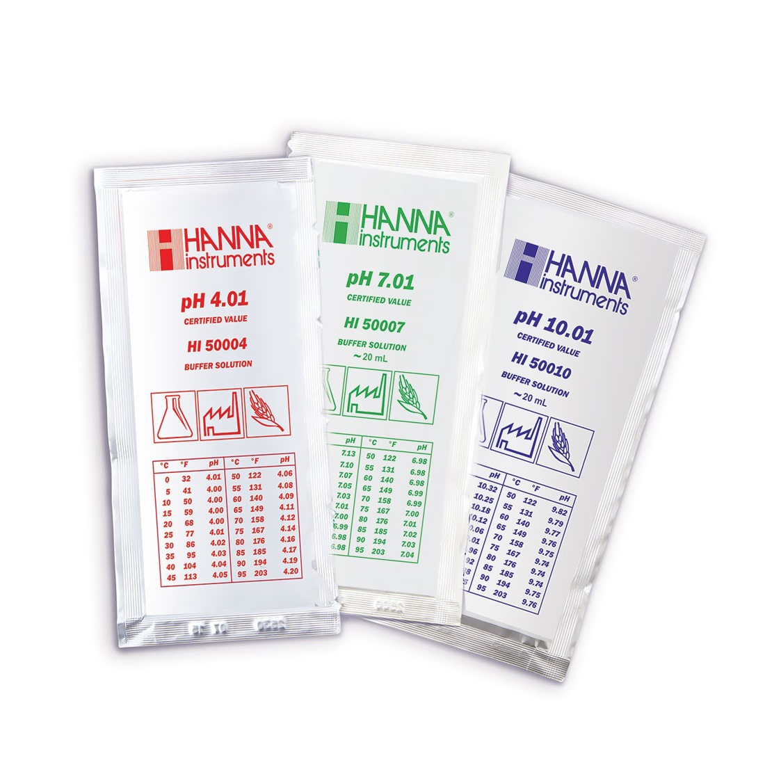 Wygodne w użyciu praktyczne saszetki z gotowym do użycia roztworem buforowym o ustalonym pH. Dzięki zastosowaniu jednorazowych saszetek z roztworami, kalibracja sprzętu jest łatwiejsza, precyzyjna i zdecydowanie szybsza. Eliminowane jest ryzyko błędów spowodowanych stosowaniem zabrudzonych czy źle wykonanych roztworów kalibracyjnych. Roztwory są dostępne w wersji z certyfikatem w jakości standardowej i bez certyfikatu.