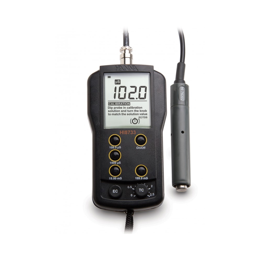 Lekki i kompaktowy HI 8733 pozwala na pomiar przewodnictwa w 4 odrębnych skalach. Jest dostarczany w pudełku z czteroelektrodową głowicą. Pomiary przeprowadzane przy pomocy tego urządzenia są szybkie i wiarygodne. Korekta temperatury wykonywana jest automatycznie dzięki wbudowanemu w sondę czujnikowi temperatury. Nadaje się do użytkowania zarówno w laboratorium, jak i w warunkach terenowych. Sonda jest chroniona przez nasadkę z PVC.
