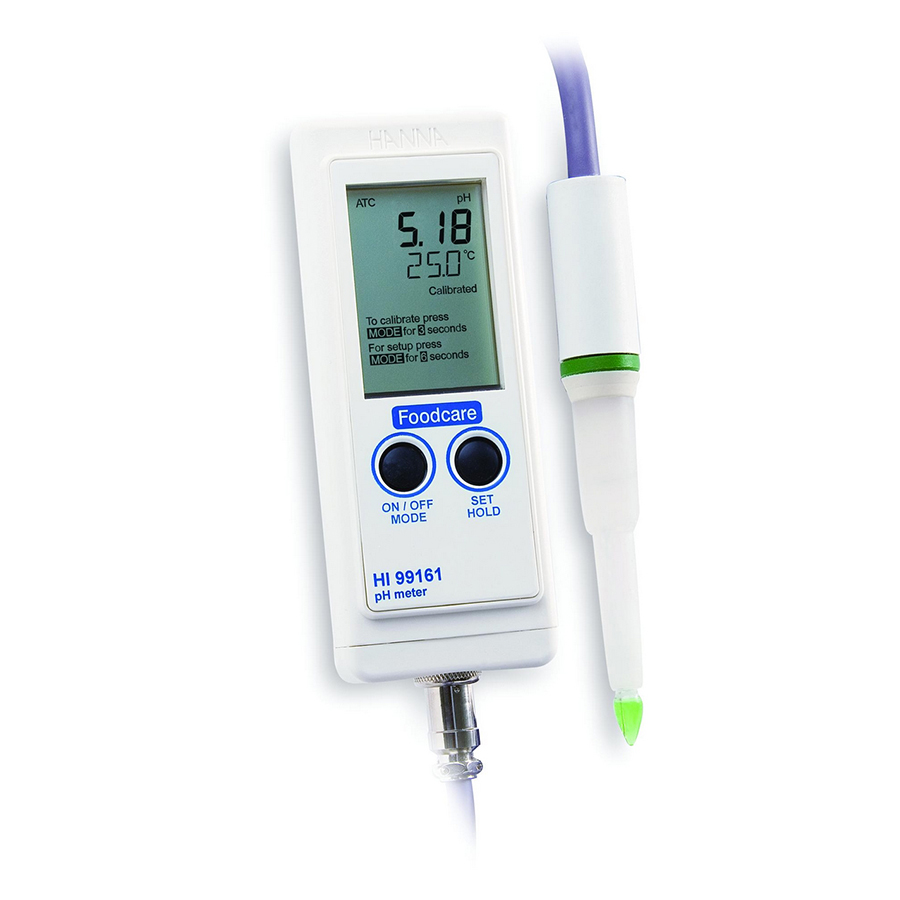 pH-metr z elektrodą wbijaną o kształcie igły, do pomiarów pH żywności. Doskonały do analizy produktów białkowych, półmiękkich lub proszków takich jak np.: masło, mleko, jogurt, ser, mięso, owoce, warzywa, soki owocowe, przyprawy itp. Aparat jednocześnie wskazuje pH i odczyt temperatury. Automatyczna jedno- lub dwupunktowa kalibracja dzięki zapamiętanym odczytom dwu serii buforów standardowych.