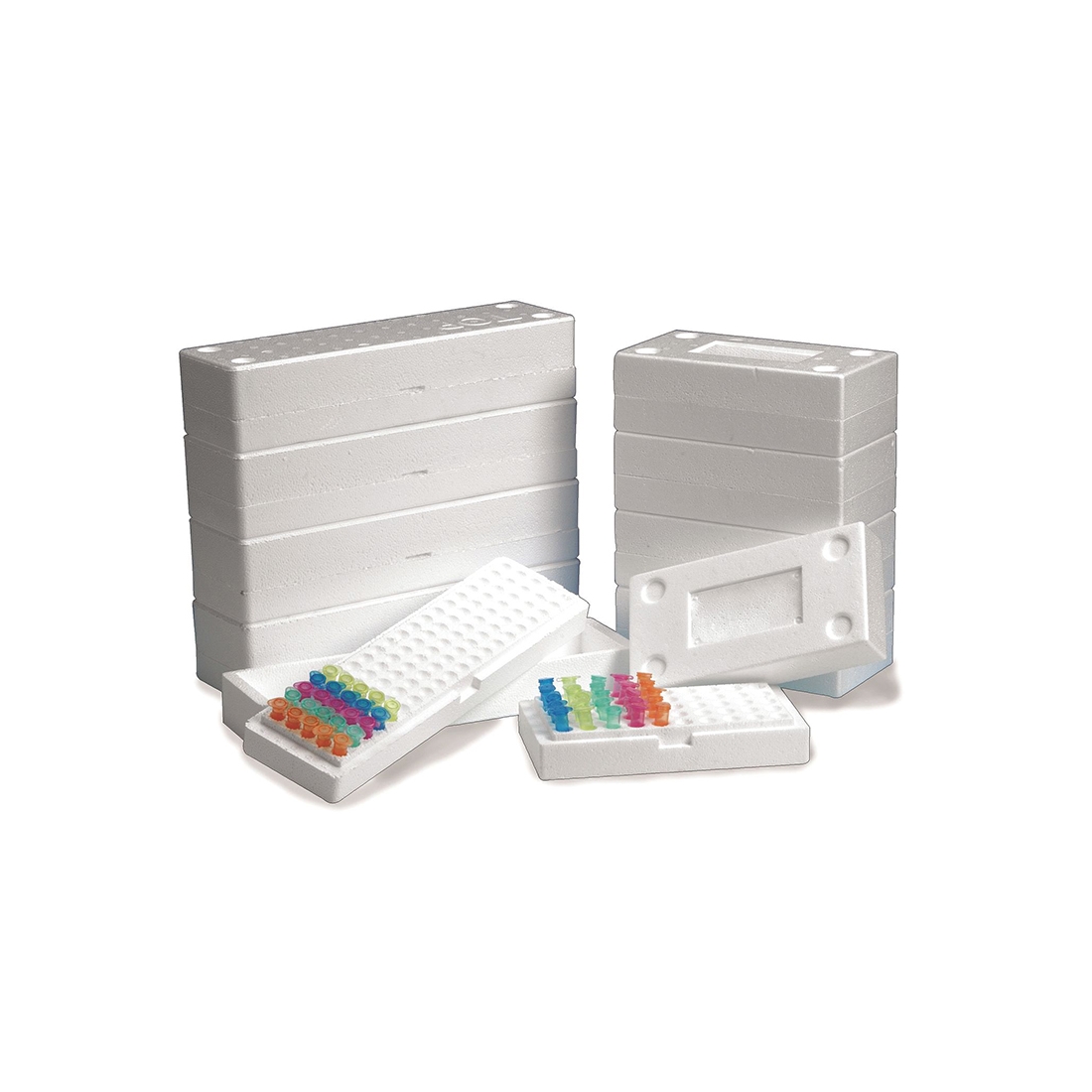Lekkie i poręczne styropianowe pudełka na probówki 1,5/2,0 ml. Wykonane z EPS. Posiadają specjalnie zaprojektowane duże odstępy między miejscami co ułatwia chwytanie probówek.