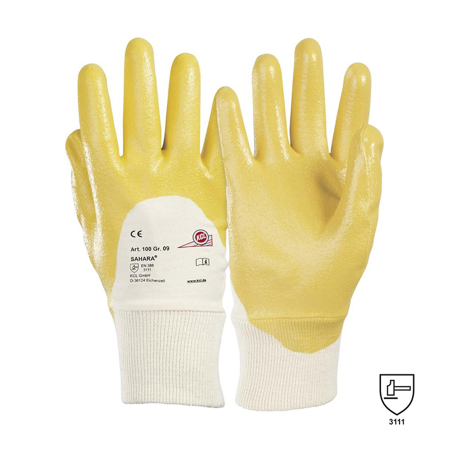 Wysokiej jakości rękawice wykonane z naturalnej bawełny pokrytej żółtym nitrylem w wewnętrznej części dłoni. Posiadają ściągacz chroniący nadgarstek. Sposób wykonania rękawic zapewnia aktywną wymianę powietrza, dobrą chwytność oraz ochronę przed substancjami oleistymi. Bez silikonu, zmiękczaczy i alergenów.