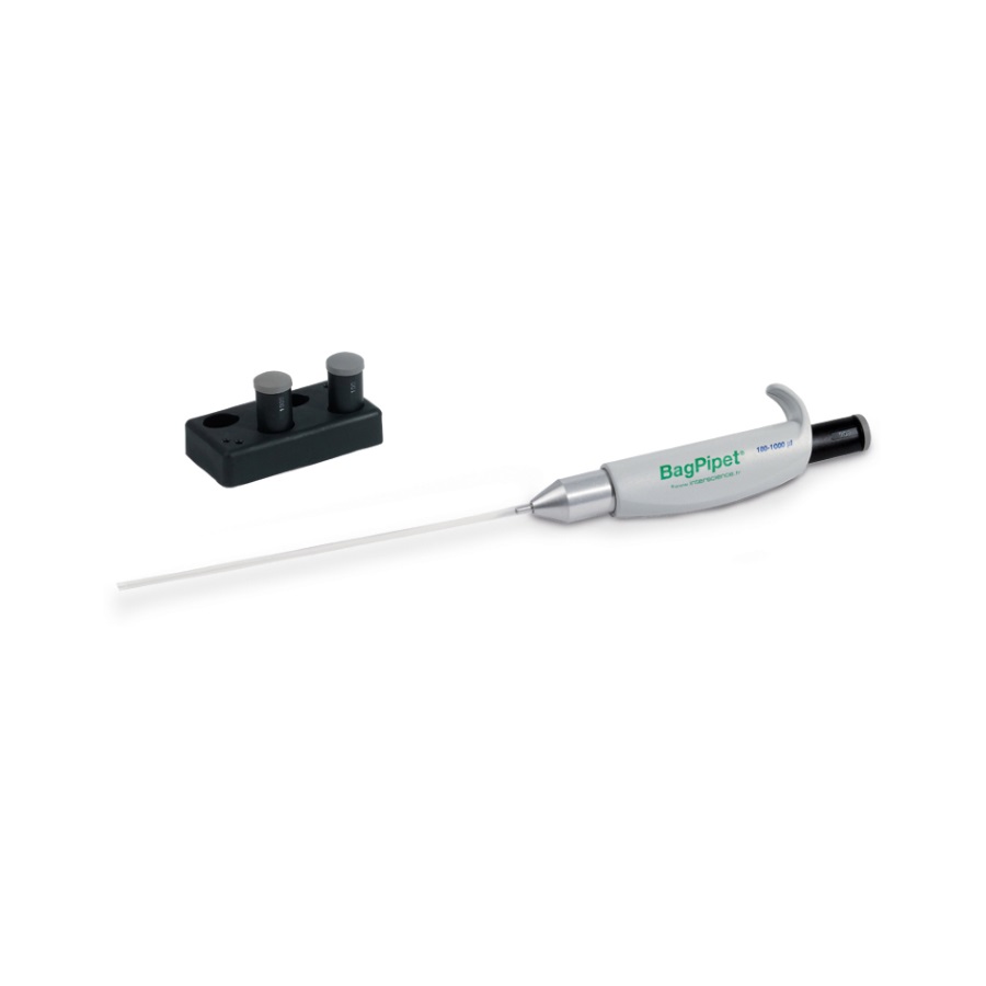 Automatyczna pipeta BagPipet® nastawna na 0,1, 0,9 i 1,0 ml. Pipeta współdziała z końcówkami sterylnymi BagTips® (Nr-Art. K-1088 i K-1089) przystosowanymi do pobierania próbek produktów spożywczych i mlecznych. Kształt słomki umożliwia łatwe pobranie lepkich, niejednorodnych produktów i eliminuje ryzyko zatkania końcówki pipety.