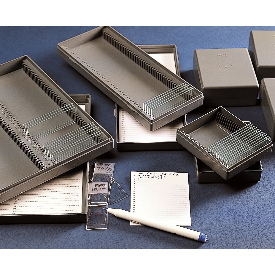 Pojemniki na szkiełka mikroskopowe z PS. Umożliwiają przechowywanie do 100 szkiełek jednocześnie. Przykrywki pojemników można zdejmować całkowicie. Przegródki są numerowane.