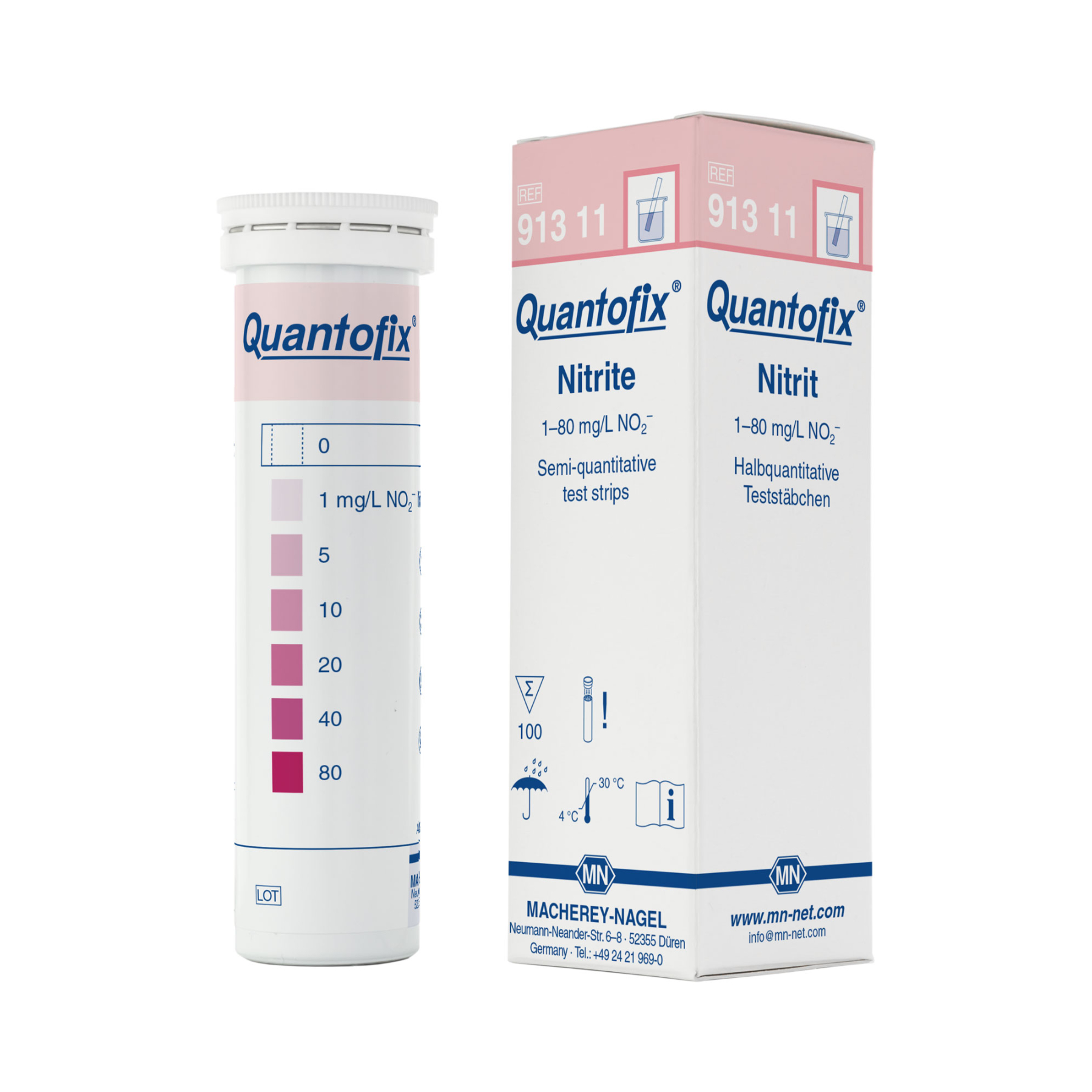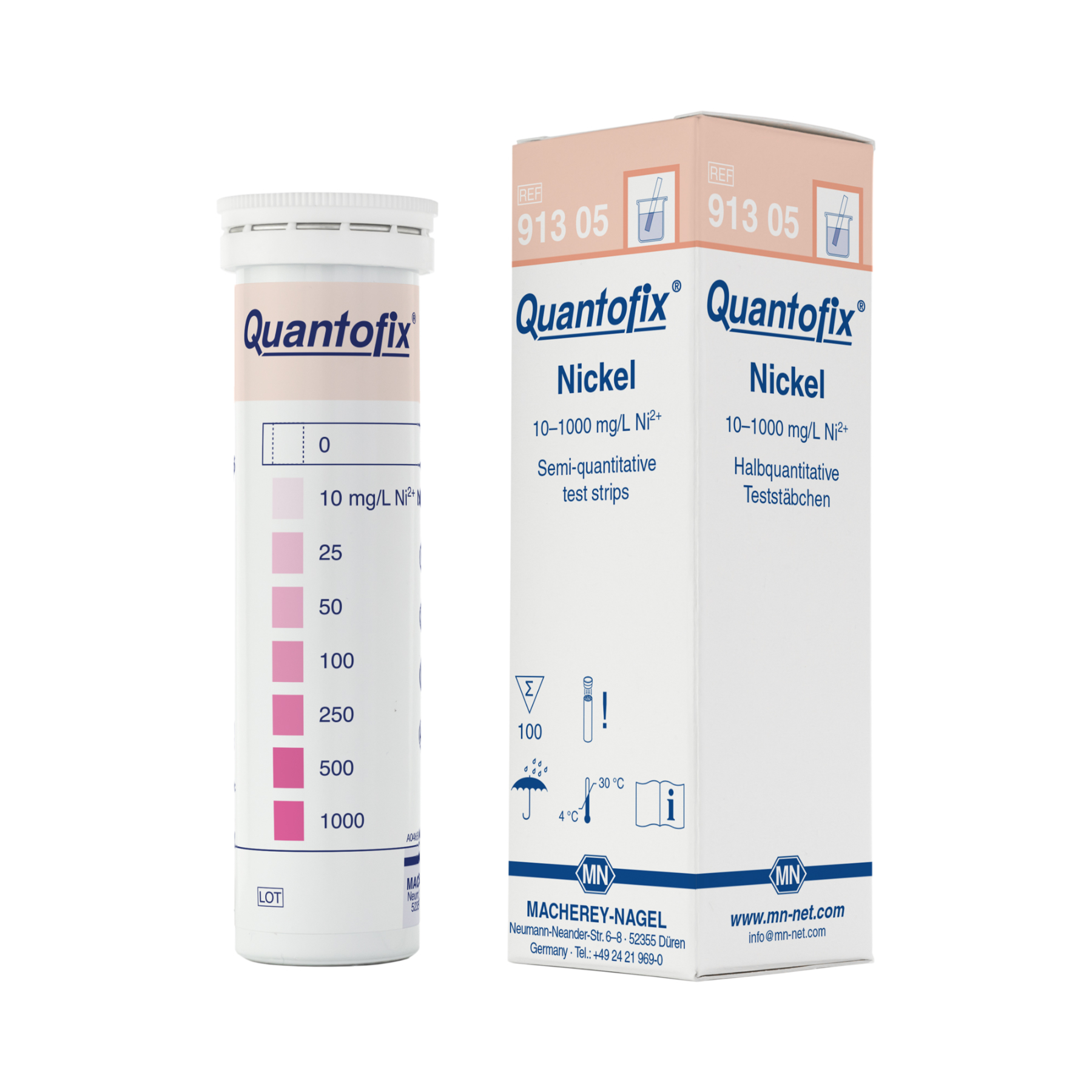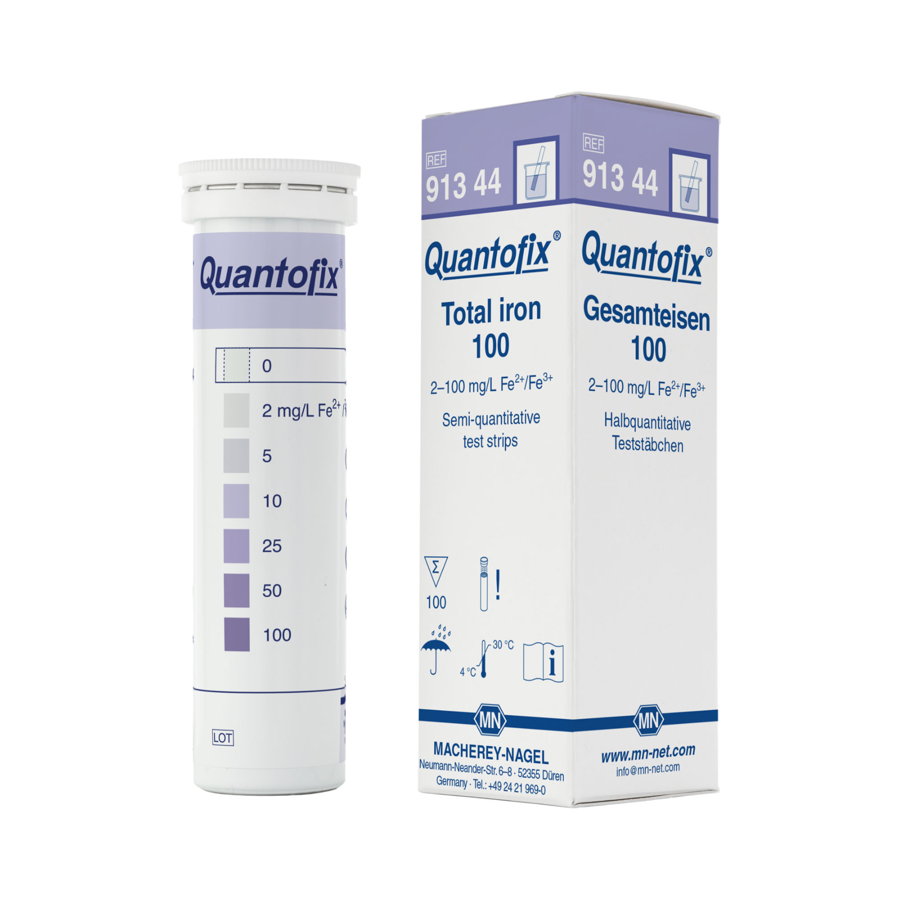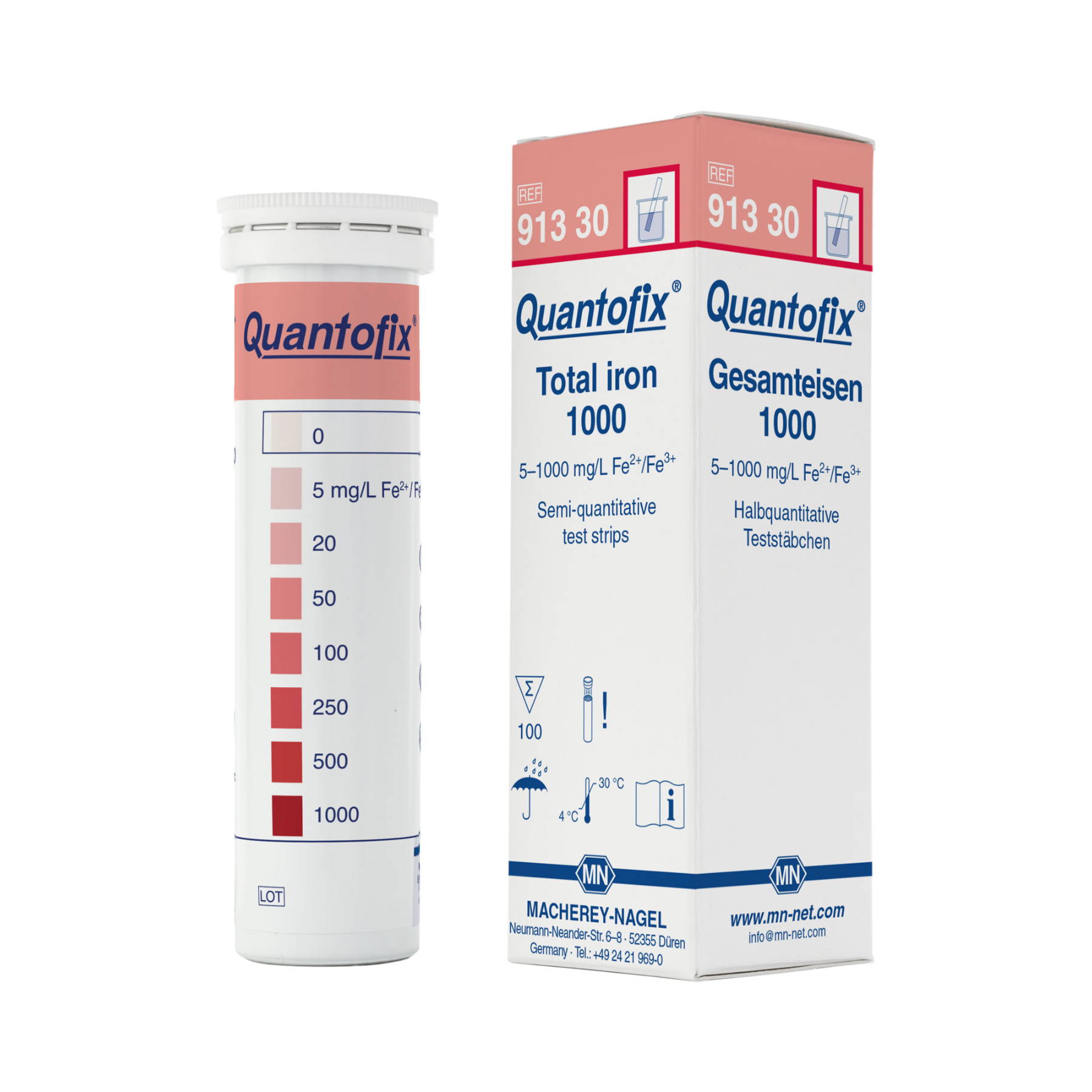 Półilościowe paski testowe Quantofix do oznaczania żelaza. Zmiana barwy z białej na niebieskofioleową lub ciemnoczerwoną. Wykorzystywane w laboratoriach, przemyśle wodociągowym, rolnictwie, monitorowaniu jakości wody pitnej.