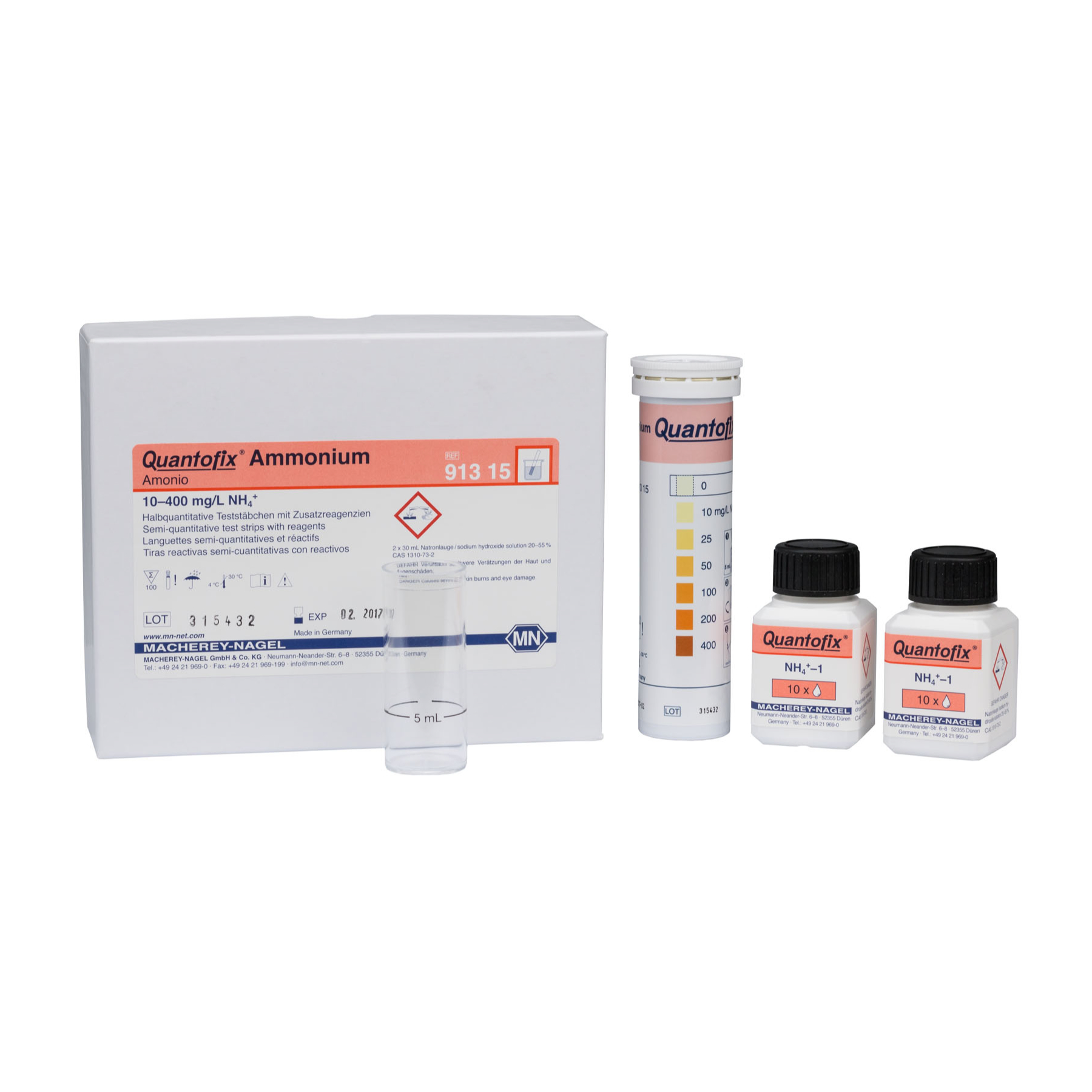 Półilościowe paski testowe do oznaczania amoniaku. Opakowanie zawiera 100 szt. papierków i odczynniki. Zmiana barwy z jasnożółtej na pomarańczową. Zakres pomiarowy: 10-400 mg/l.