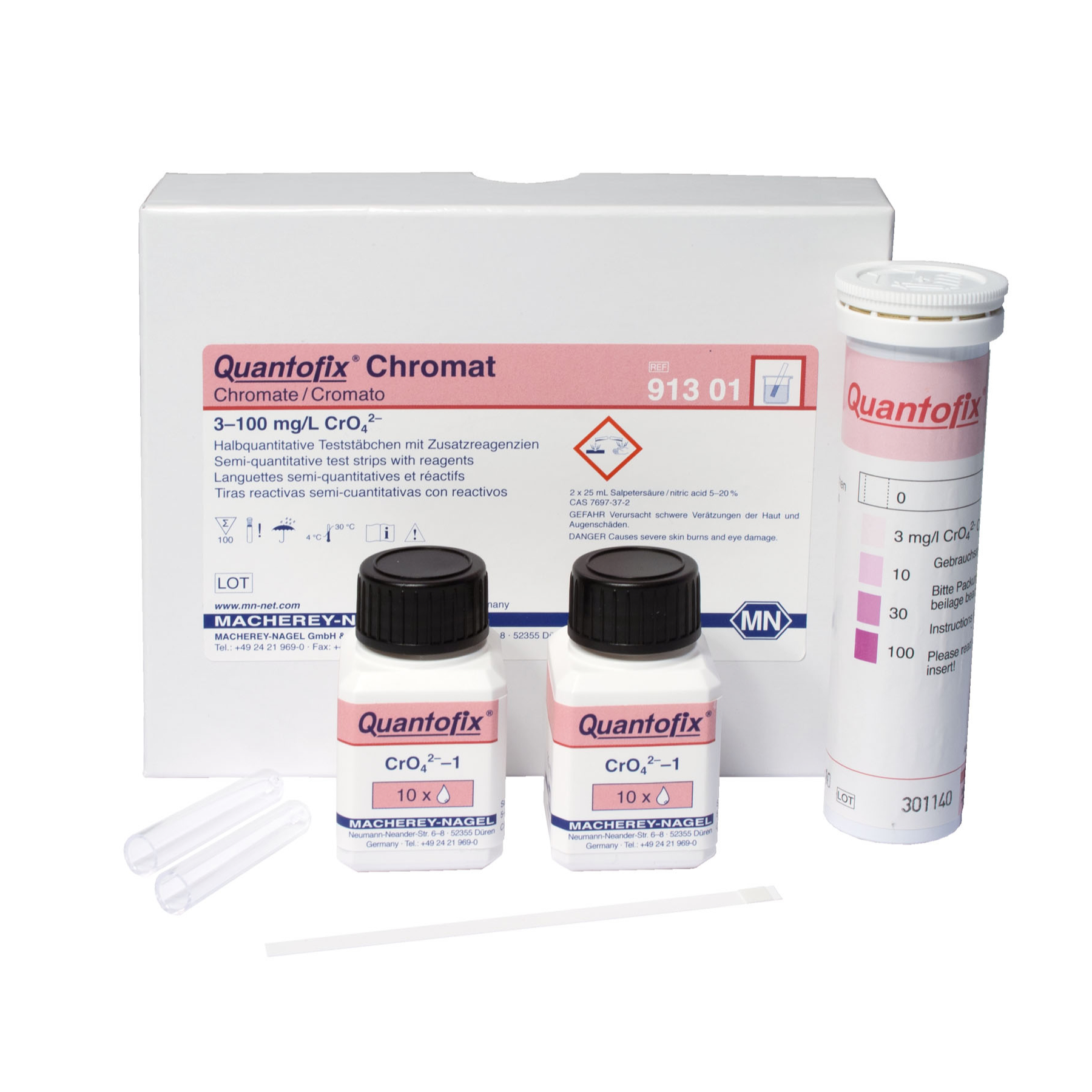 Półilościowe paski testowe Quantofix do oznaczania chromianów. Zmiana barwy z białej na fioletową. Zakres pomiarowy: 3-100 mg/l CrO₄²–. Opakowanie zawiera 100 szt. papierków w tubie i odczynniki.