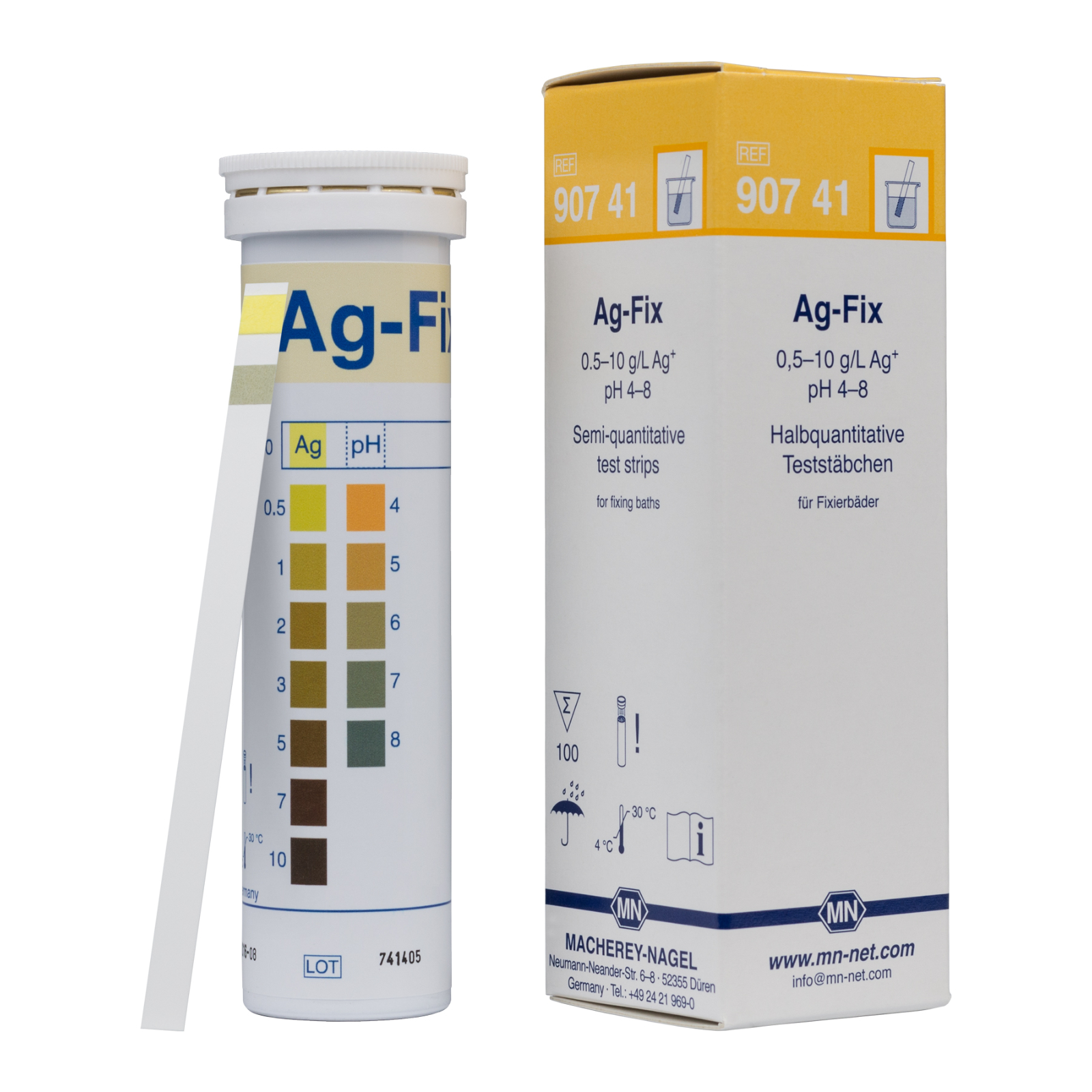 Paski wskaźnikowe Ag-Fix służą do półilościowego oznaczania jonów srebra w zakresie od 0-10 g/l. Jednocześnie umożliwiają pomiar odczynu roztworu w zakresie od pH 4 do pH 8. Sprawdzą się doskonale do kontroli parametrów kąpieli fotograficznych. Opakowanie zawiera 100 sztuk pasków Ag-Fix.