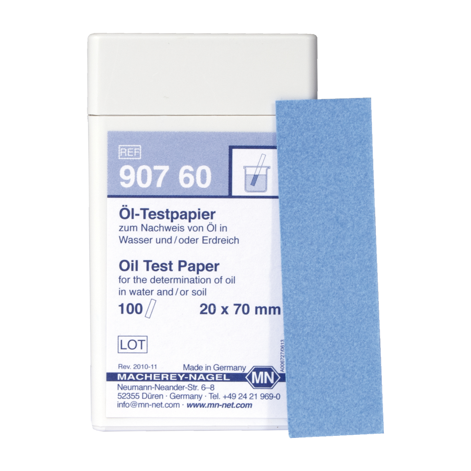 Papierki testowe do szybkiego i pewnego wykrywania zanieczyszczeń olejowych w wodzie i glebie. Czułość w dużej mierze zależy od natury węglowodoru.