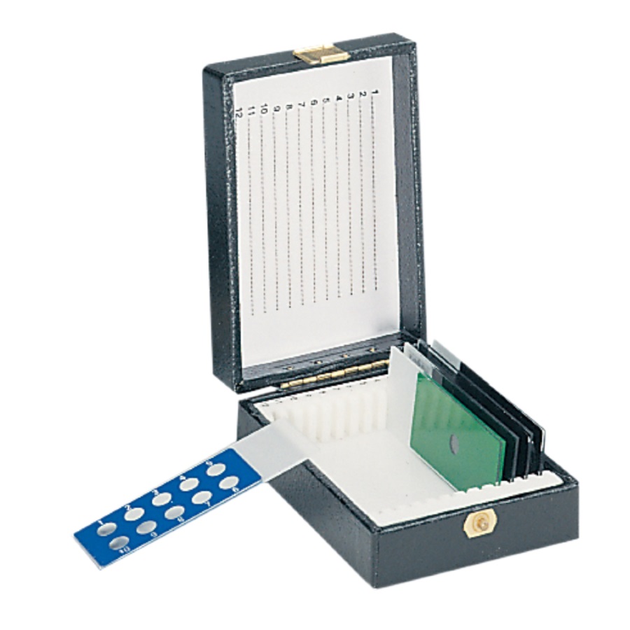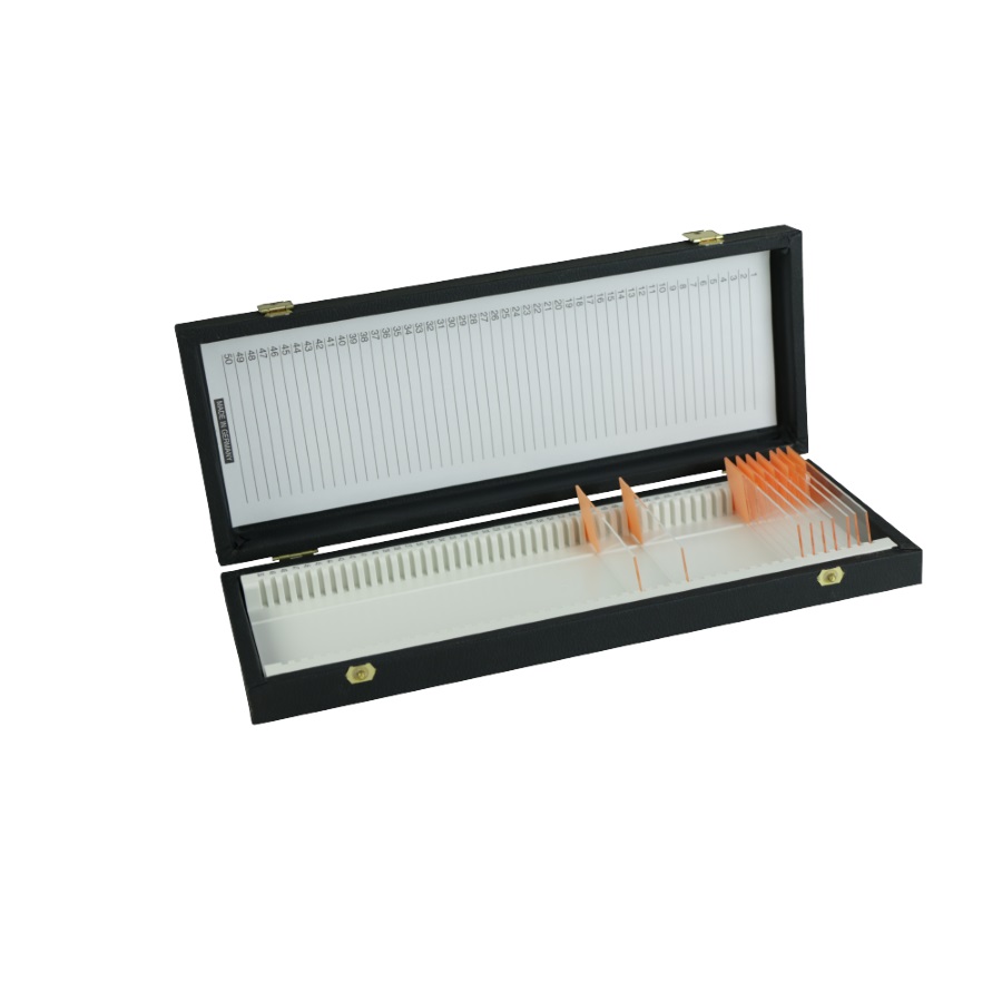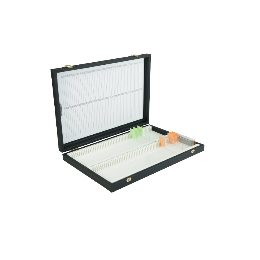 Stabilne wykonanie z drewna z czarnym obiciem, metalowymi zawiasami i niezawodnym zamknięciem zatrzaskowym. Nadaje się do przechowywania i do transportu. Pokrywka wyposażona jest w kartę na informacje służące identyfikacji szkiełek podstawowych 76 x 26 mm.