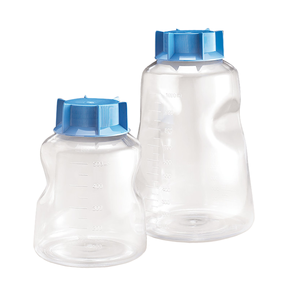 Sterylne butelki dla filtratów, kompatybilne z systemami Stericup i Steritop. Butelki są wykonane z polistyrenu, a nakrętki z polietylenu. Śr. gwintu butelki: 45 mm.