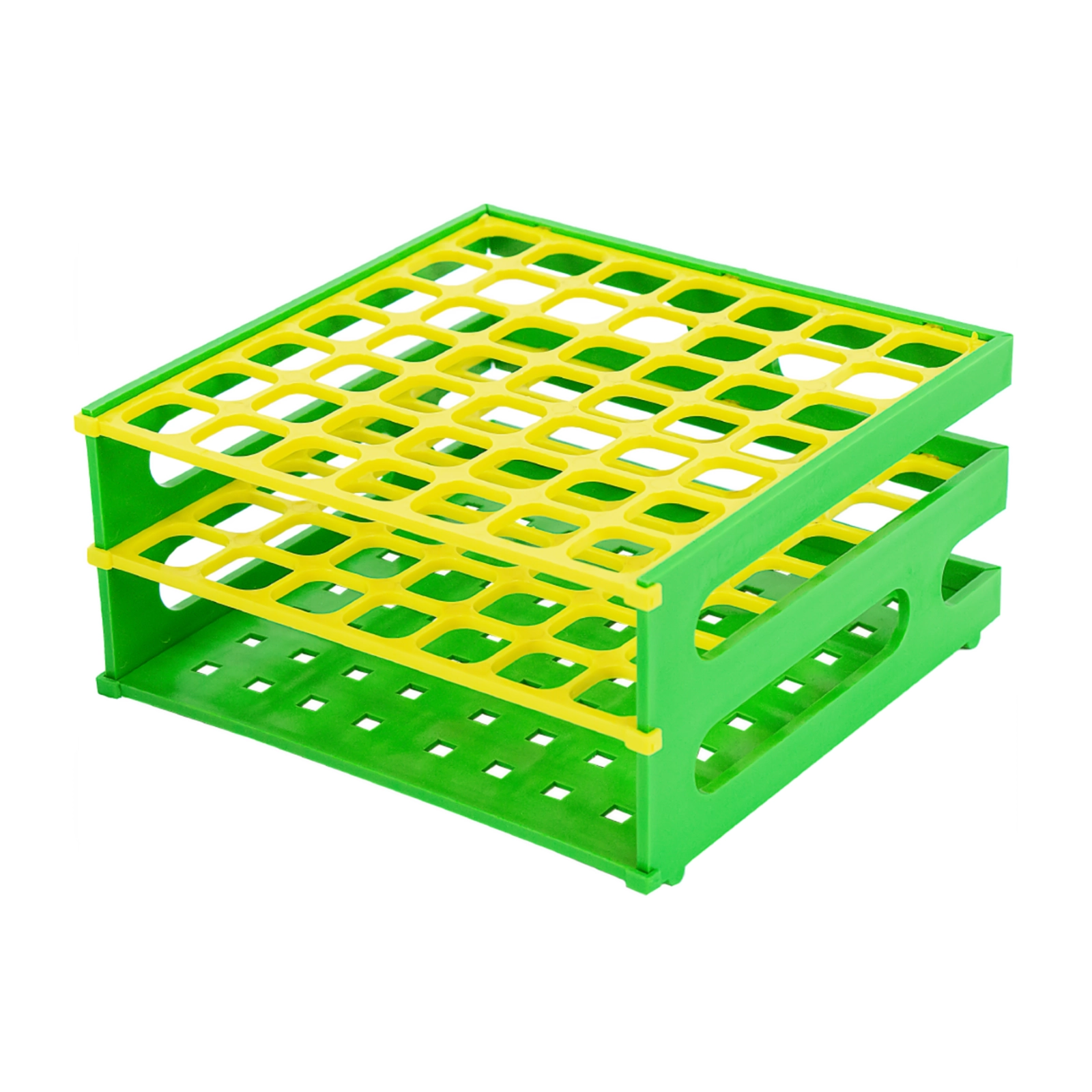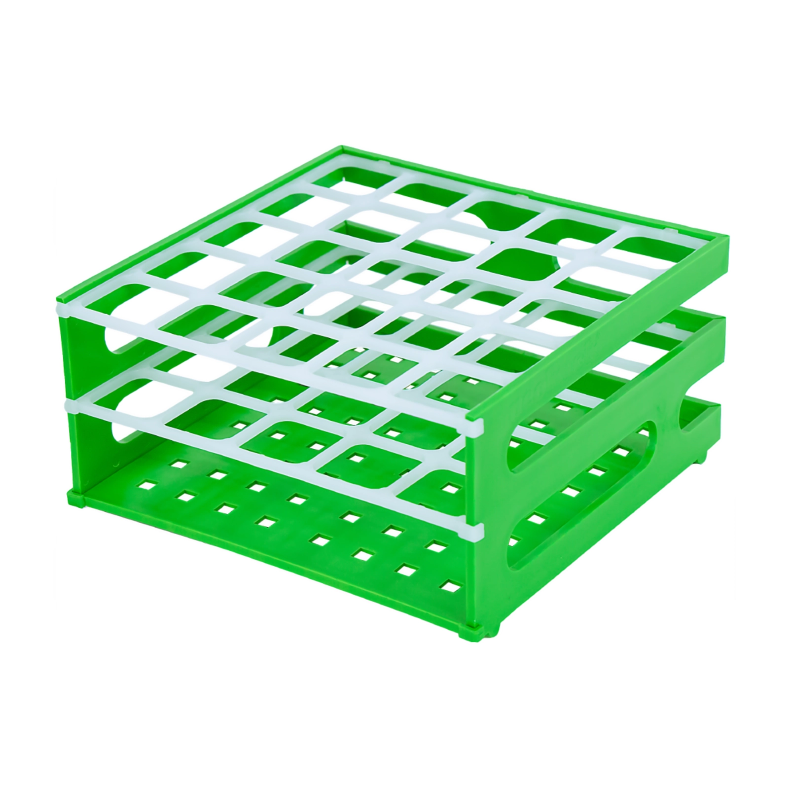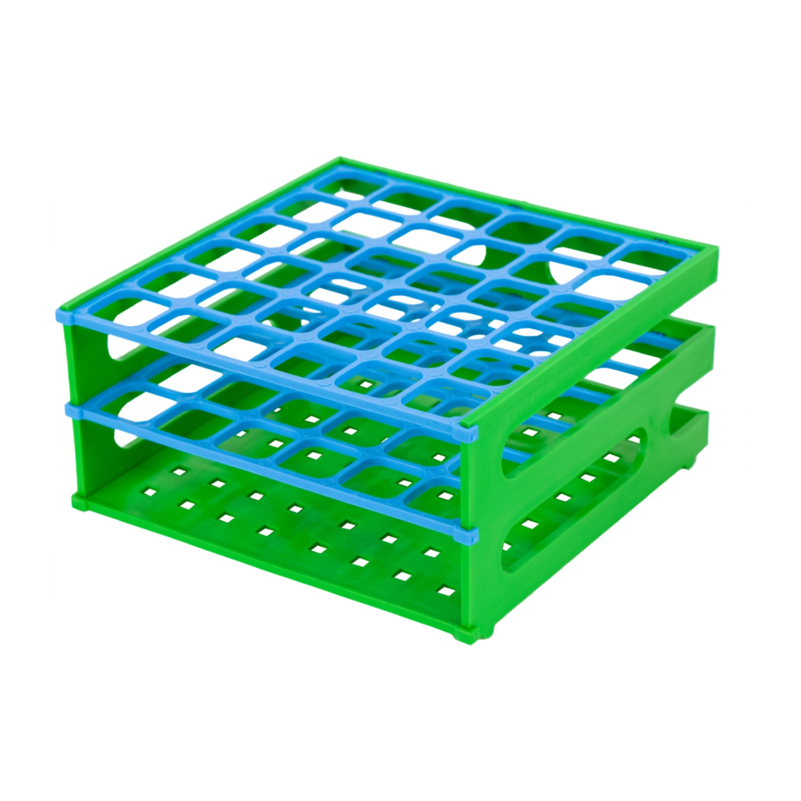 Niedrogie statywy wykonane z polipropylenu. Kwadratowe. Przystosowane do różnych wielkości probówek. Stabilne. Posiadają alfanumeryczne oznaczenia otworów ułatwiające identyfikację próbek. Części boczne i najniższy poziom przy wszystkich rozmiarach są niebieskie.