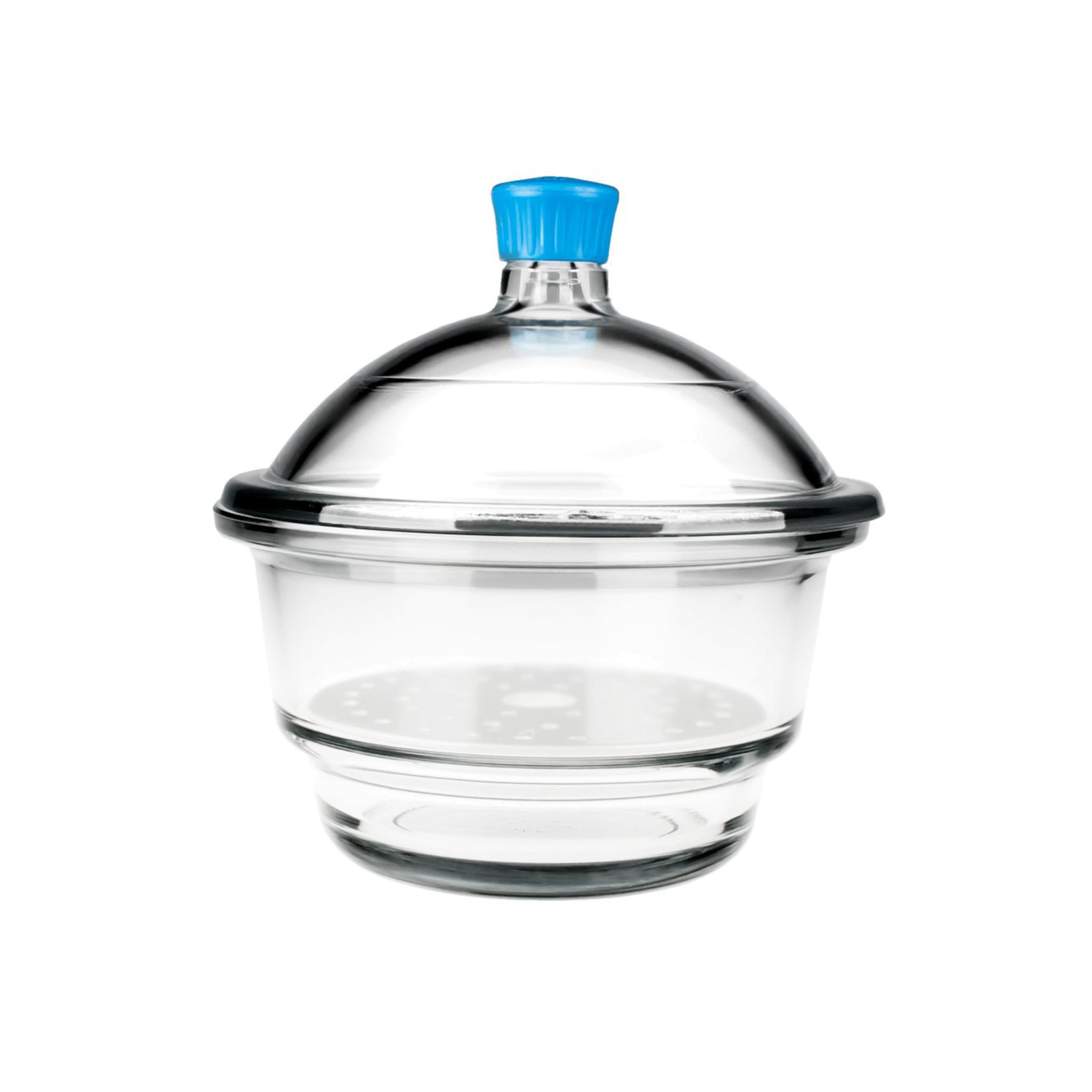 Eksykator ze szkła Simax bez zaworu. Wyposażony w plastikowy uchwyt na pokrywie. Umożliwia długotrwałe przechowywanie próbek higroskopijnych oraz powolne osuszanie. W zestawie dostarczana jest płytka porcelanowa.