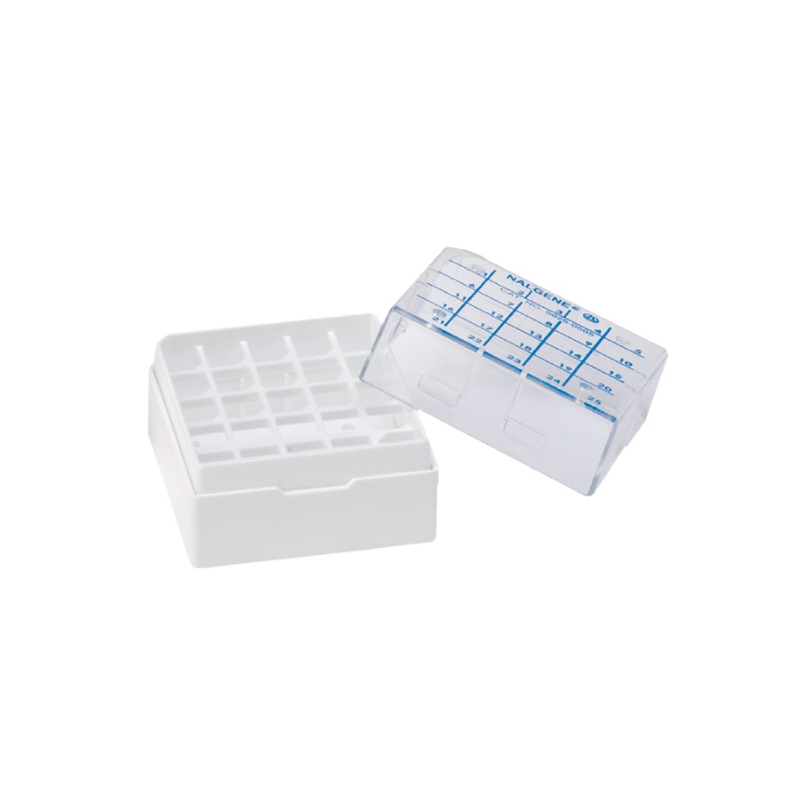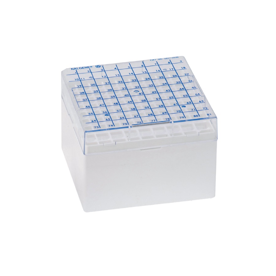 Kriopudełka z poliwęglanu. Autoklawowalne. Odporne na temperatury od -196ºC do +121ºC. Z kratką i numeracją stanowisk na pokrywie.