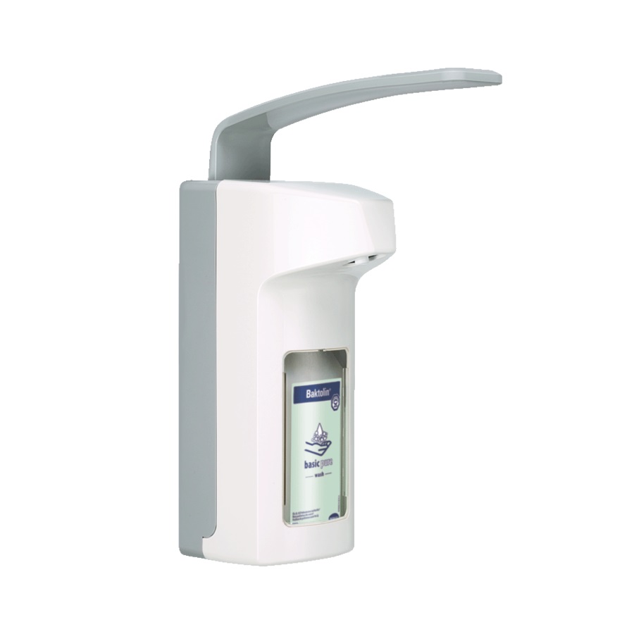 Higieniczny dozownik z tworzywa sztucznego. Przeznaczony na środki do dezynfekcji rąk, płyny myjące i pielęgnujące. Pompka dozująca może być autoklawowana. Możliwość regulacji dozowania (0,5/ 1,0/ 1,5 ml na jedną porcję). Prosty w obsłudze. Dostarczany wraz z elementami montażowymi.