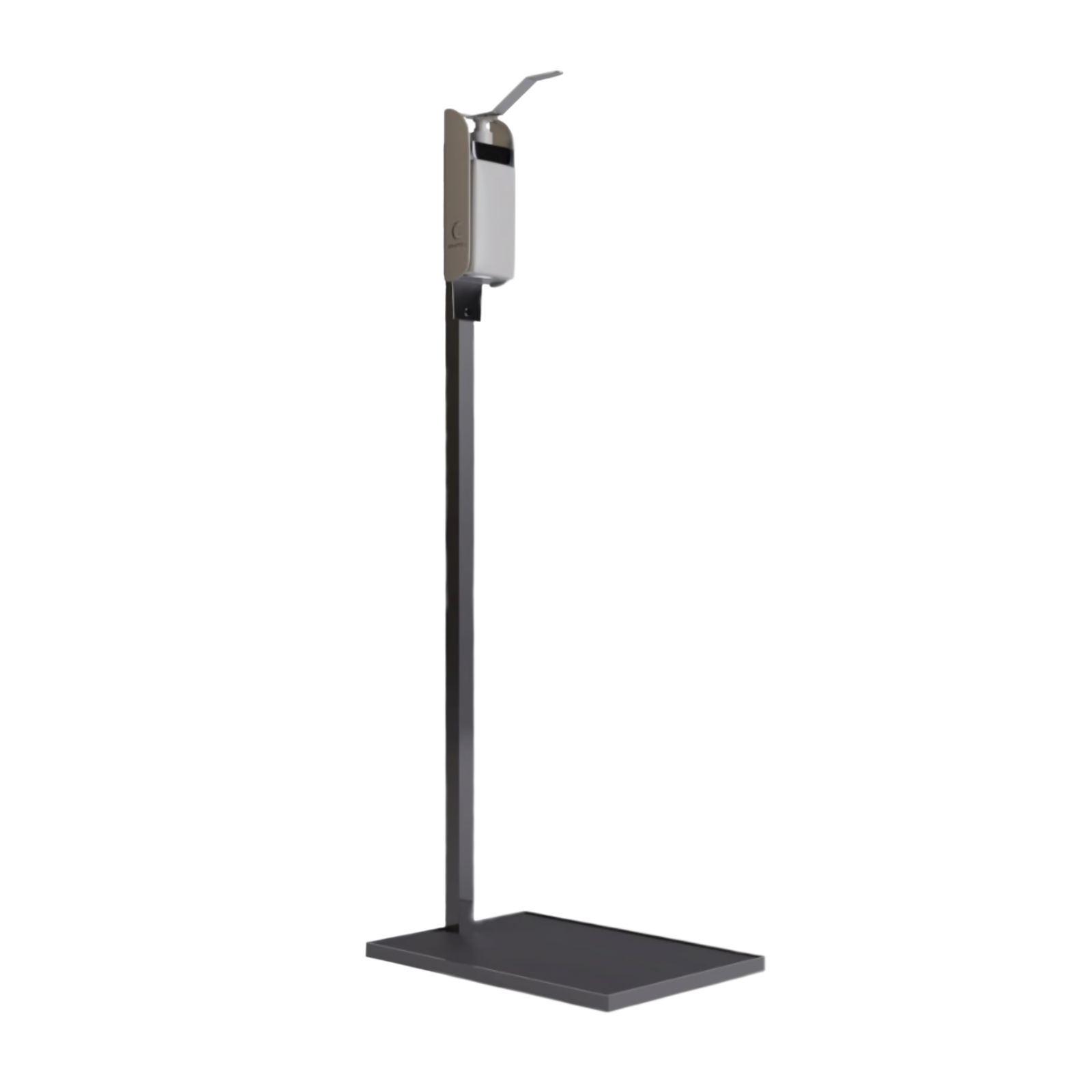 Dozownik łokciowy ze stali szlachetnej. W zestawie z butelką o poj. 1000 ml i z matą podłogową.