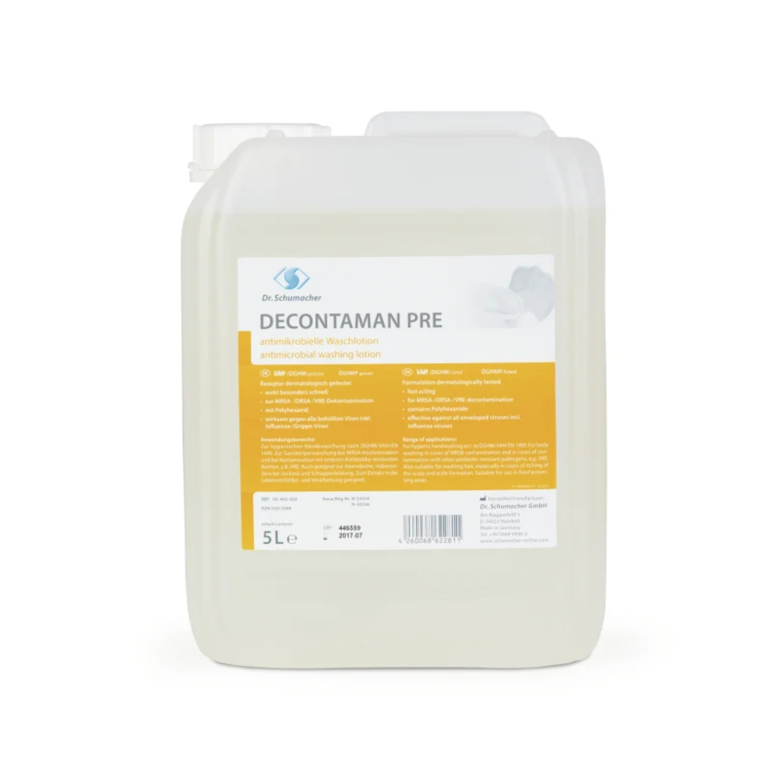 Decontaman Pre Wash to przeciwbakteryjny środek do jednoczesnego mycia i odkażania skóry i dłoni. Charakteryzuje się właściwościami bakteriobójczymi, wirusobójczymi i grzybobójczymi przy ekspozycji trwającej 30 sekund. Przebadany dermatologicznie. Wolny od fenoli, alkoholi i barwników. Bezwonny i bezbarwny.