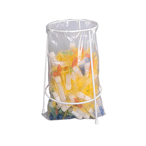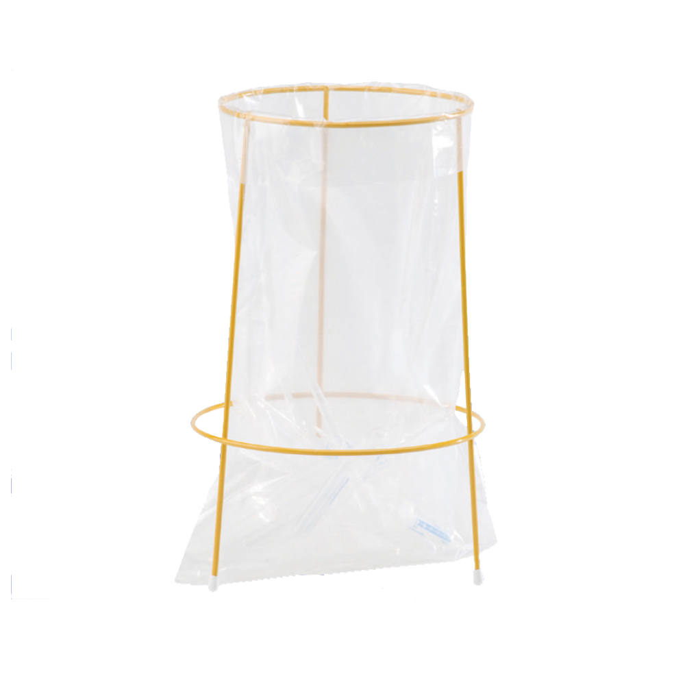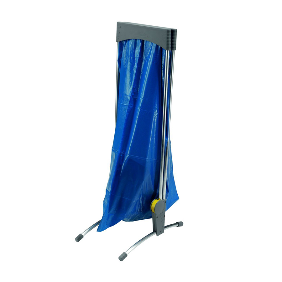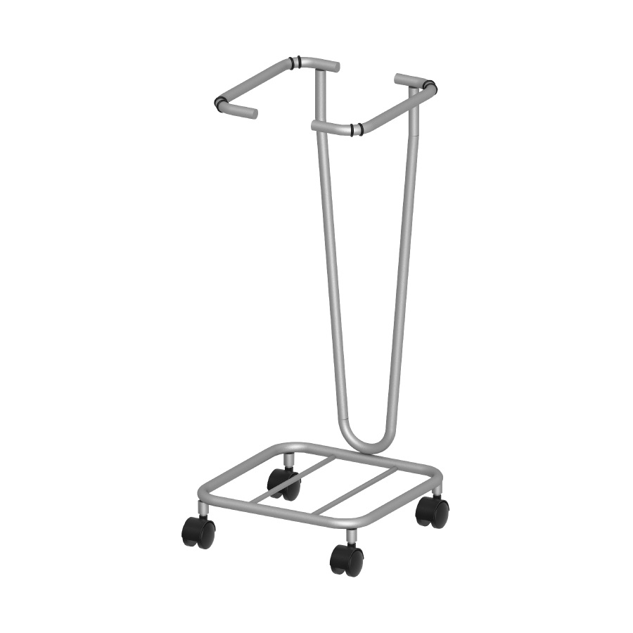 Stojak wykonany ze stalowych rurek. Stabilny, z czterema sterowanymi lekkimi kółeczkami o Ø 50 mm. Sprężyste uchwyty gwarantują pewne umiejscowienie worków. Stojak jest odkryty z trzech stron, co ułatwia wyciąganie napełnionych worków. Wysokość 834 mm idealnie pasuje pod stoły robocze.