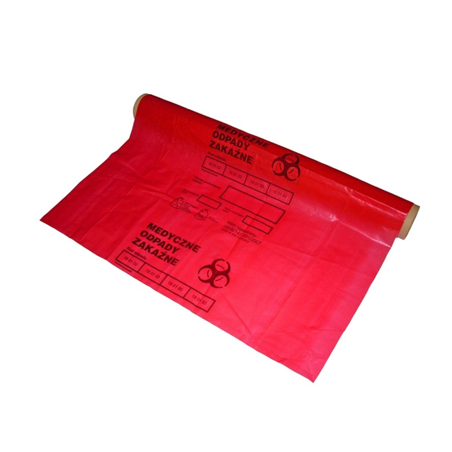 Czerwone worki foliowe na odpady, z zamknięciem. Z czarnym nadrukiem: MEDYCZNE ODPADY ZAKAŹNE.