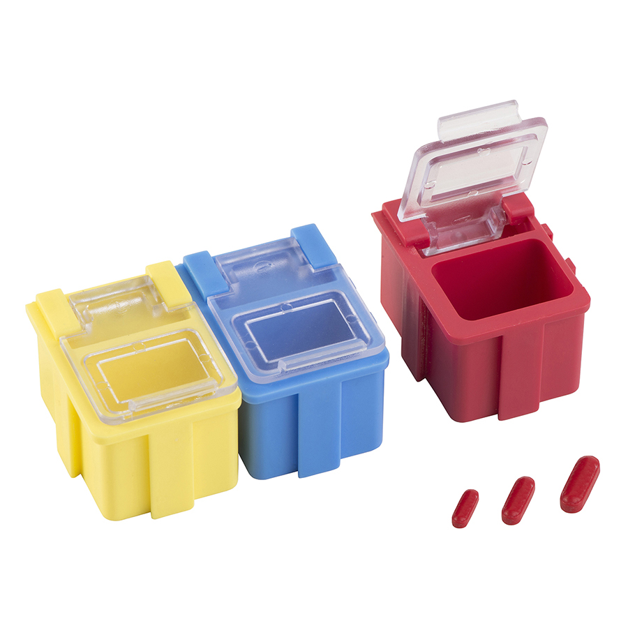 Zestaw 9 kolorowych mikromieszadełek magnetycznych o różnych rozmiarach, w powłoce z PTFE. Kolory: czerwony, niebieski, żółty. Dostarczane w pojemnikach do przechowywania, dopasowanych kolorystycznie do mieszadełek. Każdy pojemnik zawiera po 1 sztuce z następujących trzech rozmiarów: 5 x 2 mm, 7 x 2 mm, 10 x 3 mm.