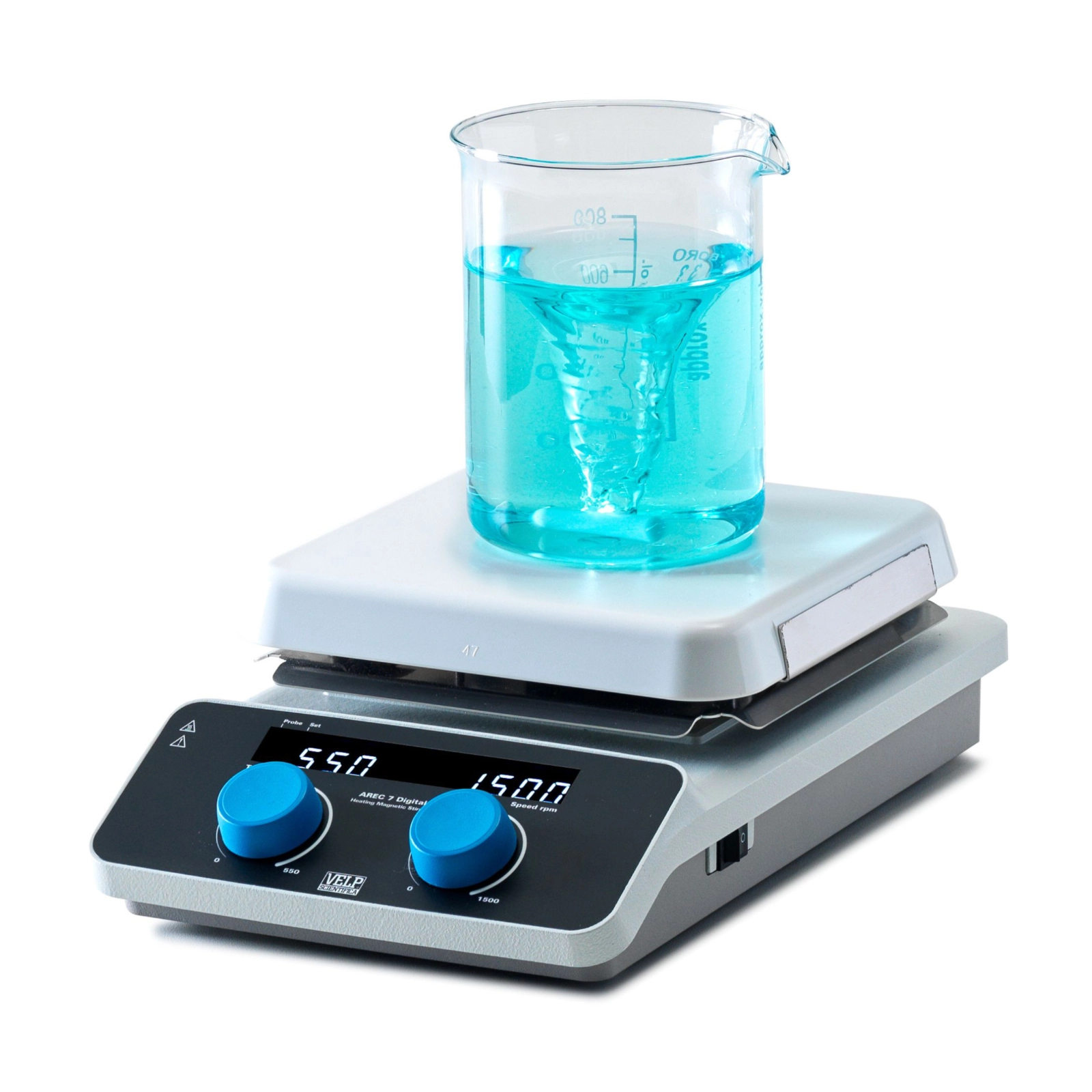 Mieszadło z grzaniem AREC 7 firmy Velp posiada płytę ceramiczną o powierzchni 180 x 180 mm umożliwiającą mieszanie maksymalnie 15 l cieczy. Urządzenie pozwala na regulację temperatury grzania do 550 °C oraz prędkości obrotów w zakresie 100-1500 obr./min.