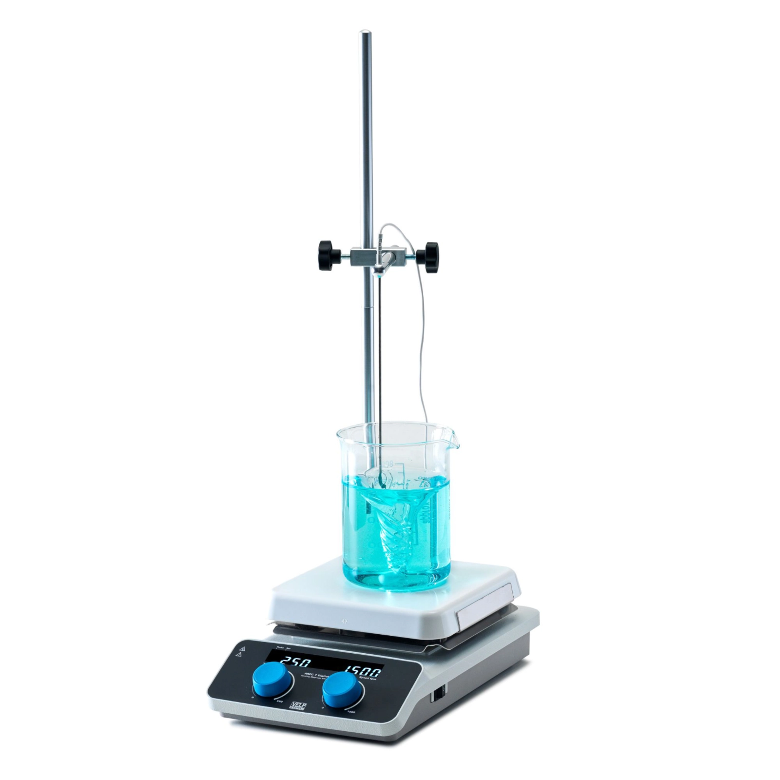 Cyfrowe mieszadło magnetyczne z płytą grzejną wykonaną ze szkła ceramicznego i maksymalną mocą grzania 550°C. Bezstopniowa regulacja prędkości obrotowej w zakresie 100-1500 obr./min. Maksymalna objętość mieszanej cieczy do 20 l. Powierzchnia płyty grzejnej odporna na korozję i łatwa w czyszczeniu. Wyświetlacz LCD do ustawiania i wskazywania temperatury oraz prędkości obrotowej. Urządzenie może być stosowane z mieszadełkami magnetycznymi o długości do 80 mm.