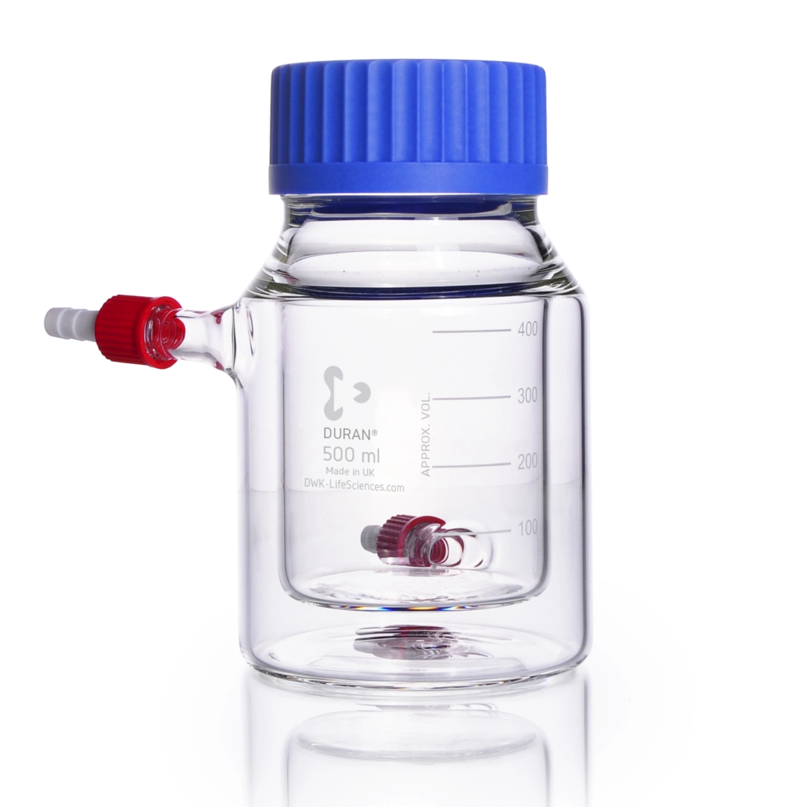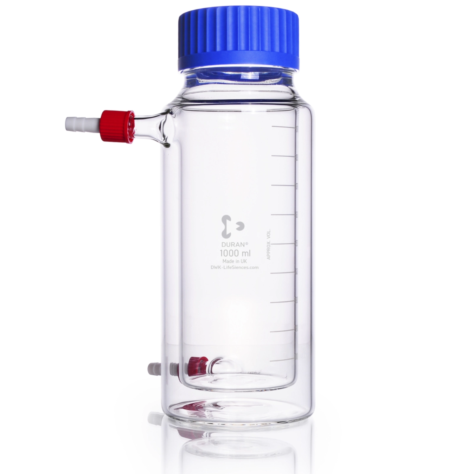 Przezroczyste butelki laboratoryjne z podwójnymi ściankami (z płaszczem). W komplecie z niebieską zakrętką GLS80 i pierścieniem wylewowym. W zewnętrznych ścianach zamontowano dwa porty GL18 z oliwkami do podłączenia węży.