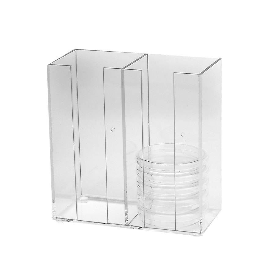 Pojemnik na szalki Petriego przystosowany do ustawienia na stole lub do montażu na ścianie. Wykonany ze szkła akrylowego. Stabilny i wygodny w użyciu. Posiada dwie przegrody na ok. 28 szalek Petriego o maks. śr. 97 mm.