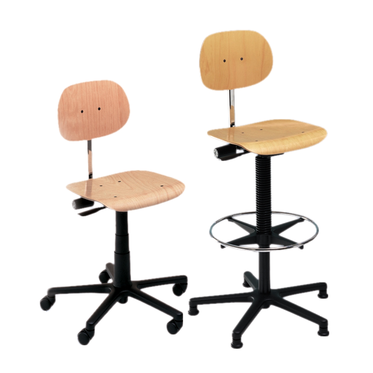 Komfortowe krzesła obrotowe. Odporne na zużycie i funkcjonalne. Siedzisko i oparcie wykonane z buku w kolorze naturalnym. Regulacja wysokości siedziska za pomocą podnośnika pneumatycznego. Możliwość ustawiania wysokości i nachylenia oparcia. Z rolkami lub stopkami ślizgowymi. Czarna podstawa z aluminium.