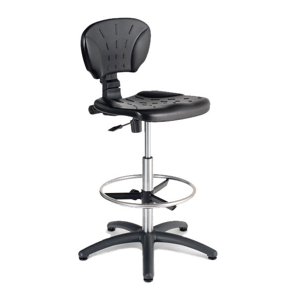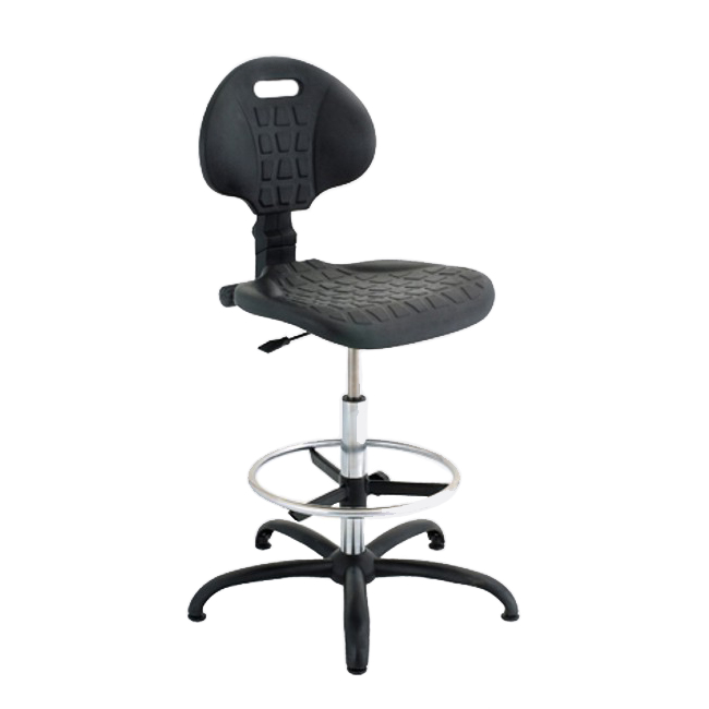 Siedzisko i oparcie wykonane z nietoksycznego, miękkiego poliuretanu, łatwego w czyszczeniu. Pięcioramienny krzyżak z trwałego poliamidu wzmocnionego włóknem szklanym. Z chromowaną podpórką na nogi o średnicy 45 cm. Materiał odporny na kurz, chemikalia i oleje. Regulacja wysokości siedziska podnośnikiem pneumatycznym.