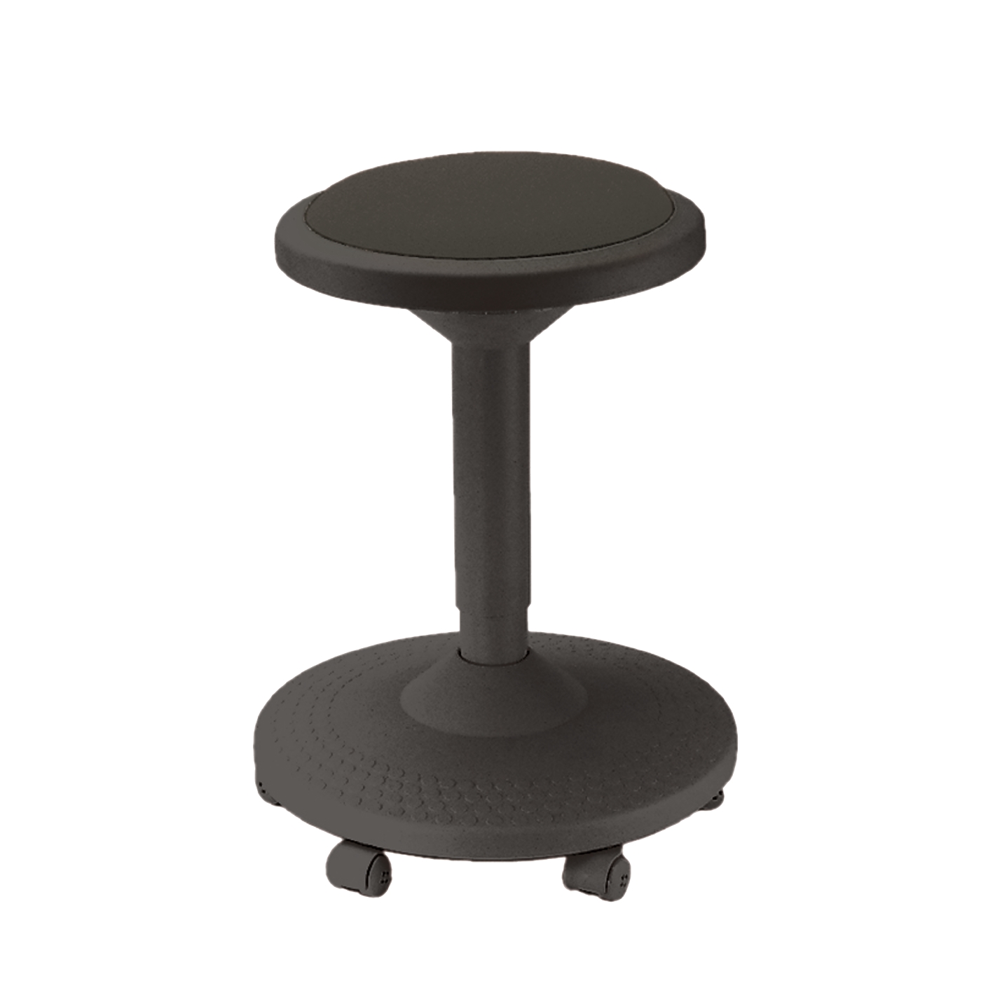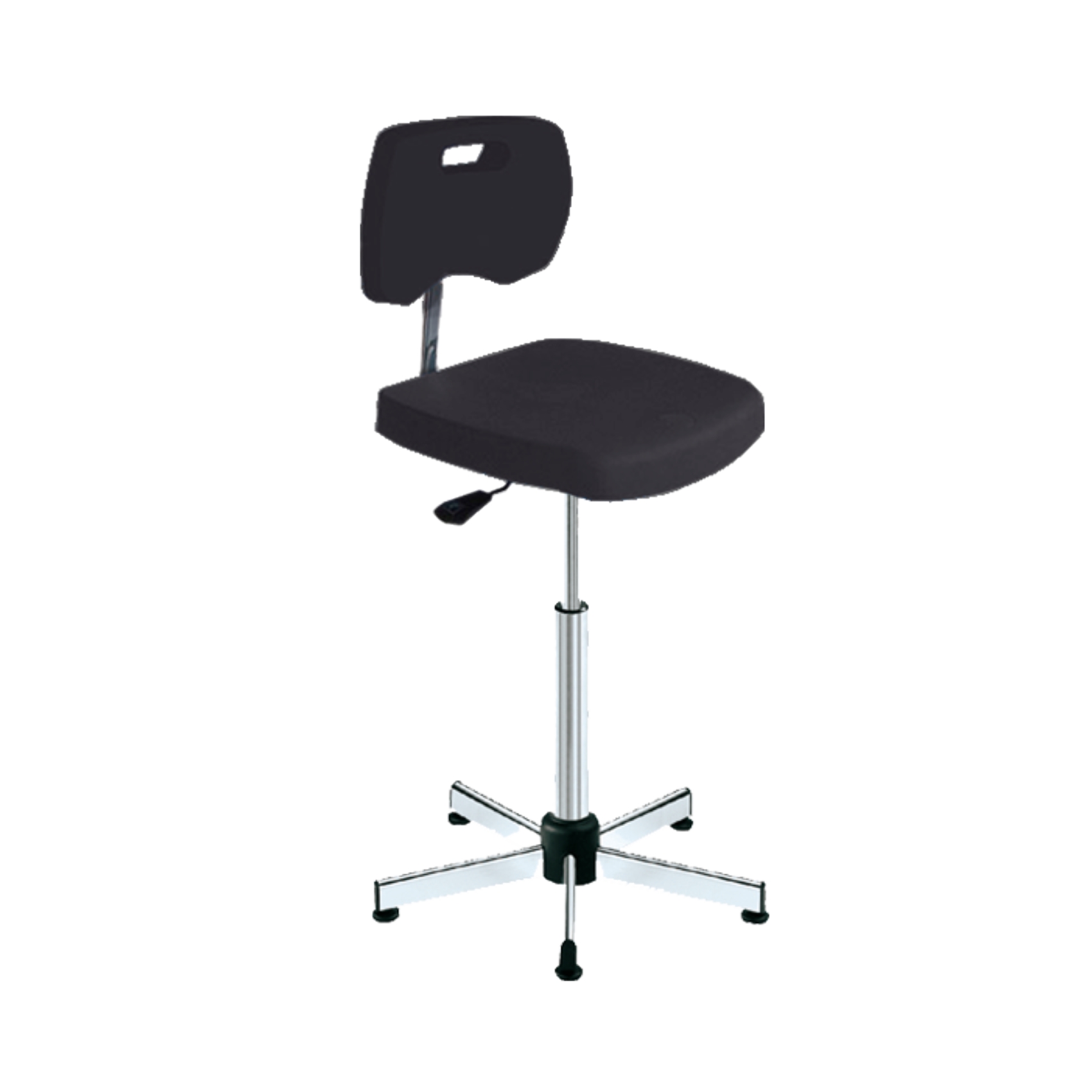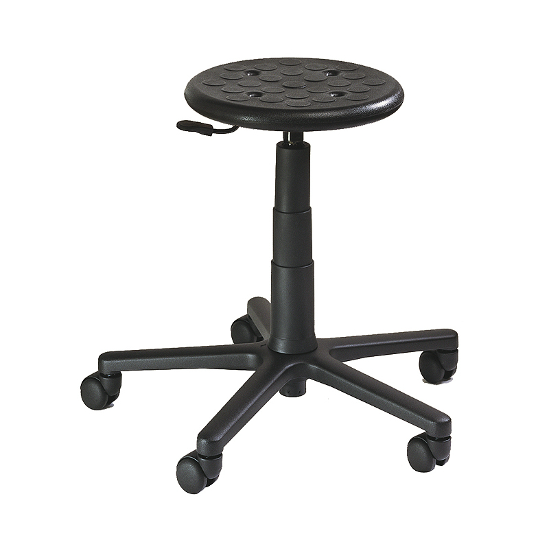 Krzesło obrotowe z okrągłym siedziskiem z czarnej pianki poliuretanowej. Odpowiednie do pomieszczeń sterylnych. Noga wykonana z czarnego aluminium, z miękkimi podwójnymi rolkami. Możliwość regulacji wysokości siedziska podnośnikiem pneumatycznym. Opcjonalnie z pierścieniem obrotowym (na zapytanie).