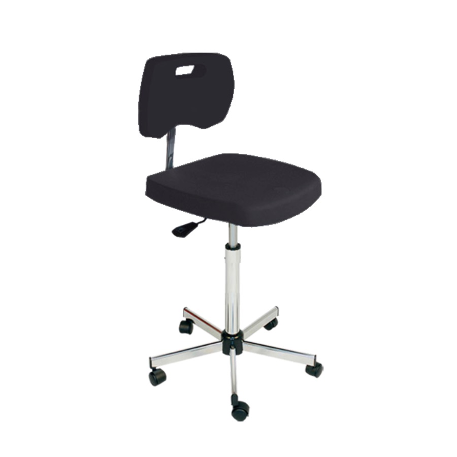 Krzesło laboratoryjne z 5 rolkami i miękkim siedziskiem z pianki poliuretanowej o gr. 4 cm. Czyszczenie za pomocą tradycyjnych środków czyszczących. Siedzisko jest odporne na przecięcia, słabe kwasy, iskry i smary. Z możliwością regulacji nachylenia.