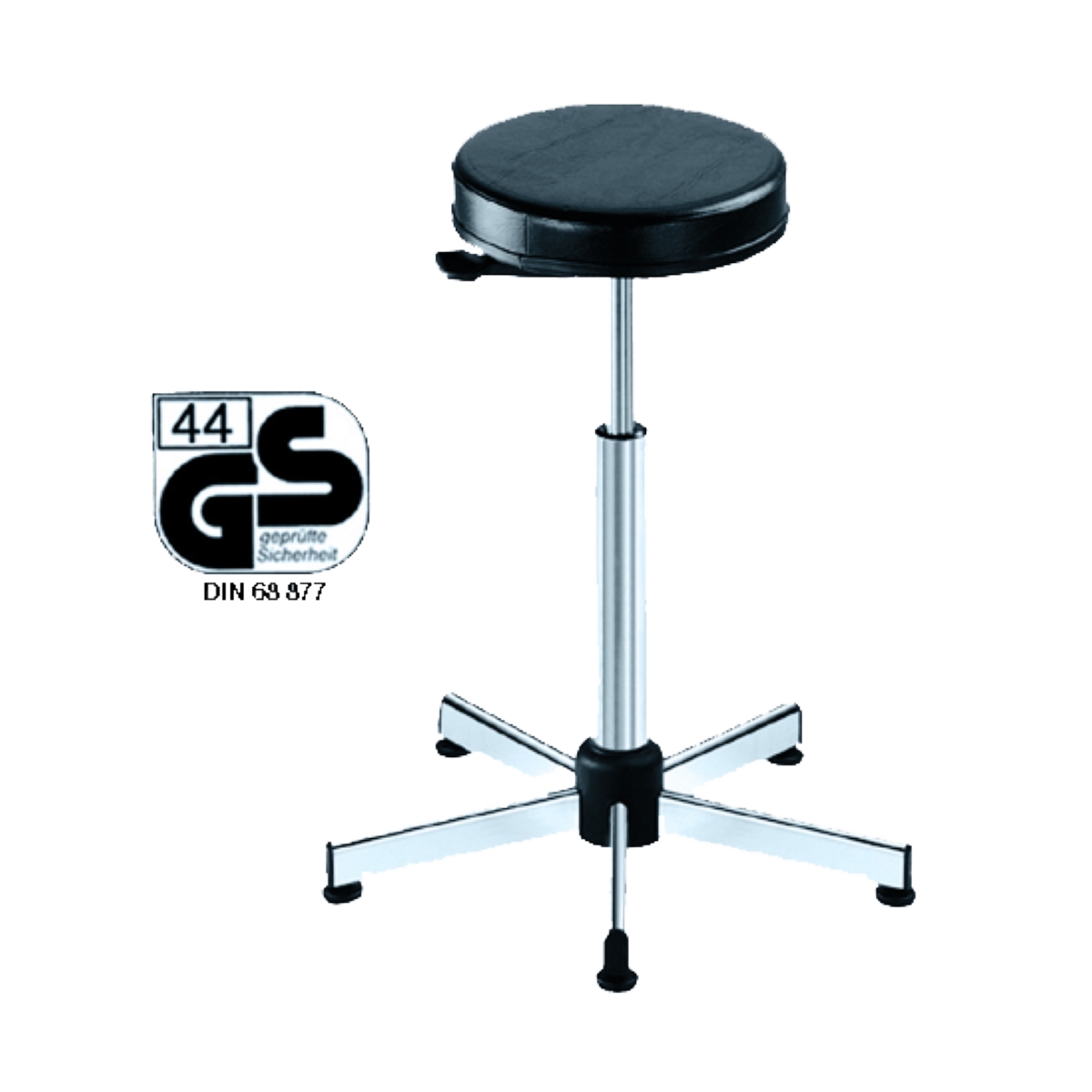Podstawa z chromowanej stali z rolkami lub ruchomymi stopkami ślizgowymi. Chromowany rdzeń. Bezstopniowa regulacja wysokości siedziska za pomocą podnośnika pneumatycznego w zakresie od 55 do 84 cm. Aluminiowa podpórka na nogi (Nr-Art. 1-1158) z możliwością ustawiania wysokości. Ze znakiem GS.