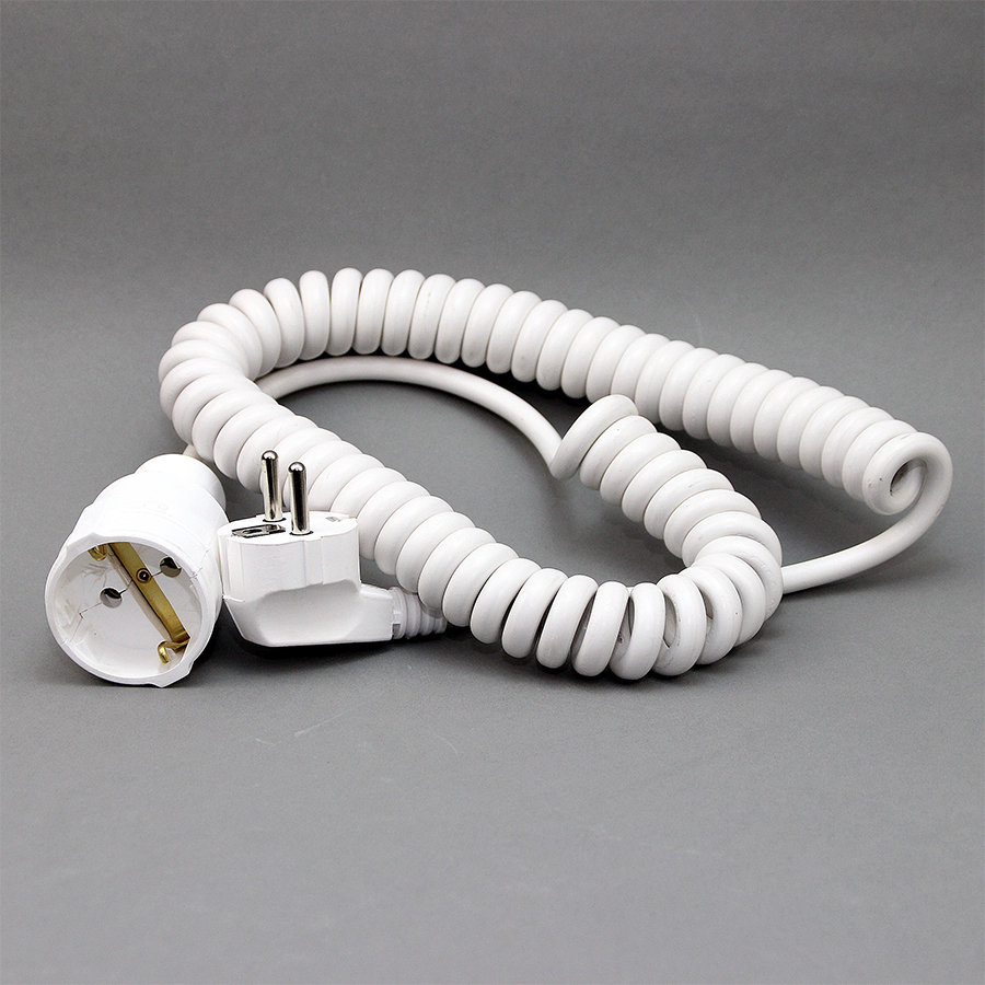 Spiralny przedłużacz z możliwością rozciągania do 2,5 m. Długość kabla nierozciągniętego: ok. 80 cm. Z wtyczką ze stykiem ochronnym oraz kablem w powłoce z PVC.