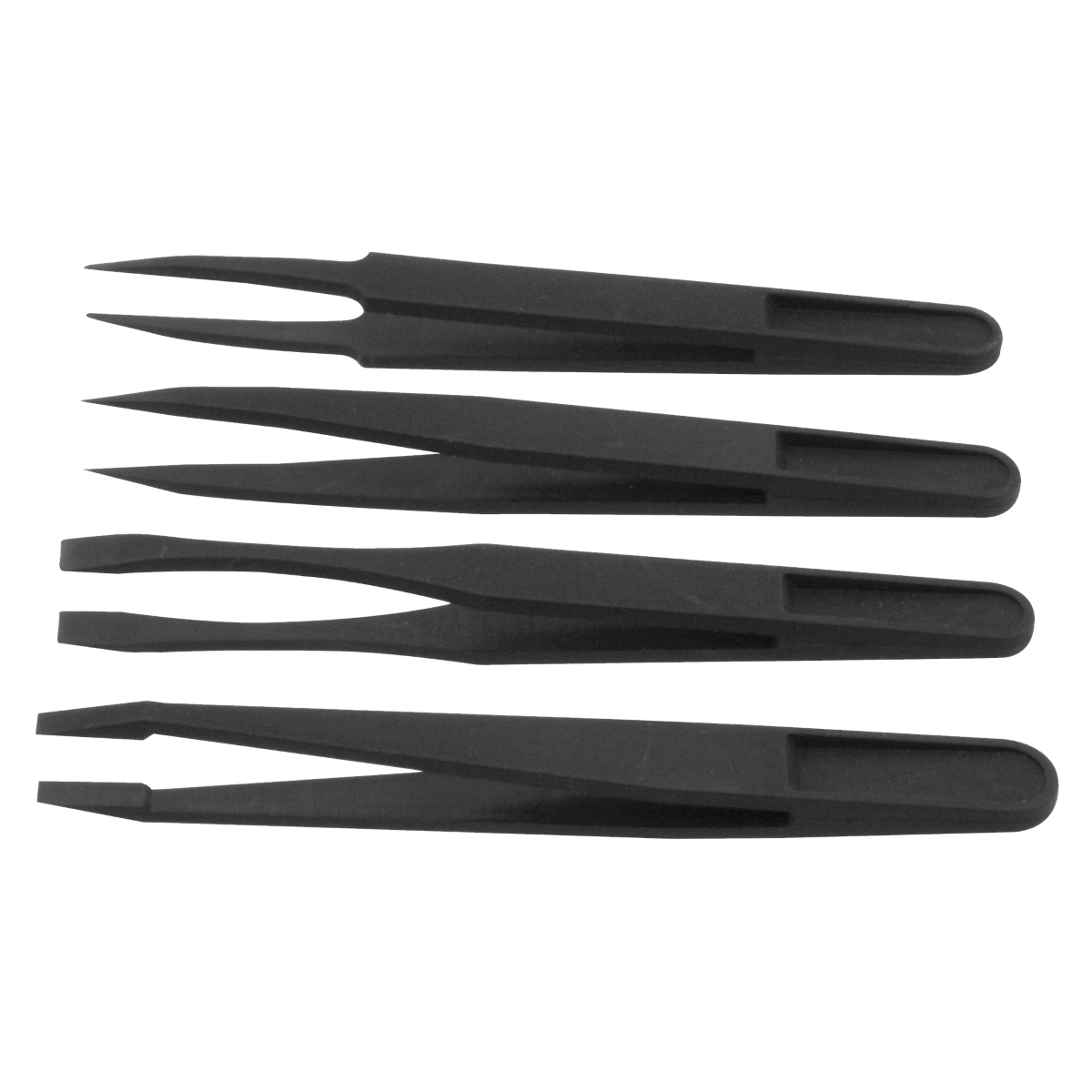 4-częściowy zestaw antystatycznych pincet z tworzywa sztucznego. Nie przewodzą prądu.