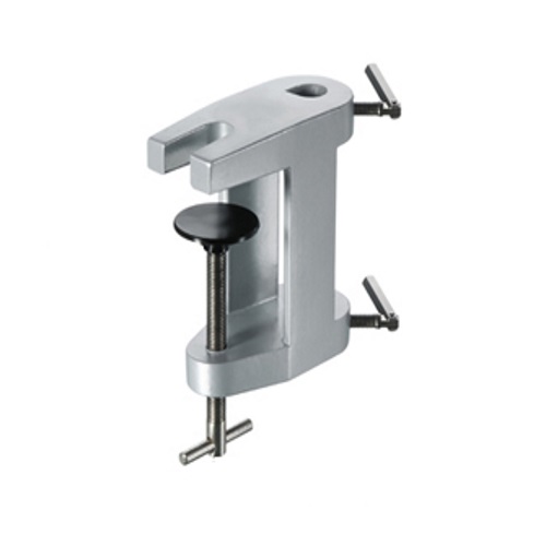 Uchwyt umożliwiający przytwierdzenie pręta statywu bezpośrednio do stołu laboratoryjnego lub blatu. Wykonany z aluminium lakierowanego proszkowo. Do prętów o średnicy maks. 13 mm i grubości blatu do 60 mm.