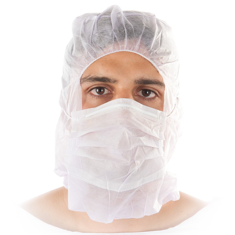 Kaptur z dwuwarstwową maską na twarz z gumami niezawierającymi lateksu oraz plastycznym noskiem. Kaptur jest w kolorze białym.
