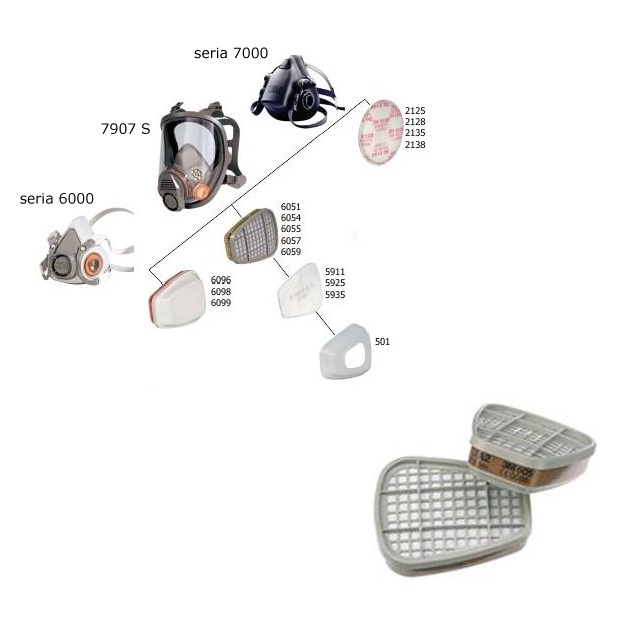 Wkłady filtracyjne przeciwpyłowe z włókniny, firmy 3M, zgodne z normą EN143. Chronią przed parą wodną, mgłą olejową i pyłami. W celu zamontowania filtra na masce należy użyć pokrywy 3M 501 i filtra 3M serii 6000.