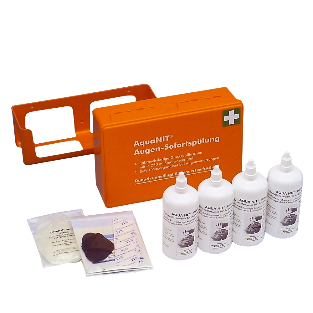 Roztwór do natychmiastowego przepłukiwania oczu. Dostarczany w pudełku z tworzywa sztucznego z uchwytem ściennym. Zestaw zawiera następujące elementy: 4 gotowe do użycia butelki wody sterylizowanej o poj. 250 ml; podręczny komplet do opatrzenia skaleczonego oka z kompresami, zasłoną na oko, plastrami i rękawiczkami jednorazowymi.