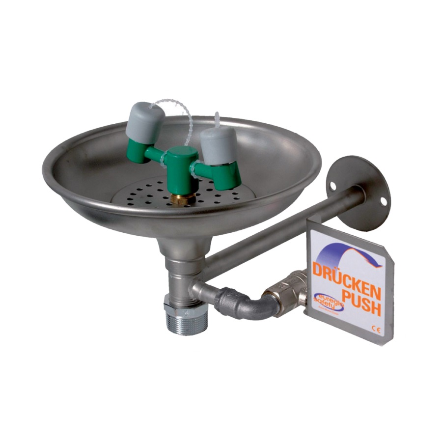 Płuczka do oczu zgodna z DIN EN 15154-2. Przeznaczona do stałej instalacji przy armaturze laboratoryjnej lub dopływach wody pitnej. Uruchamiana przez specjalny zawór z mosiądzu z przedłużoną nasadką, który nie zamyka się samoczynnie. Powłoka z tworzywa sztucznego chroni przed korozją.